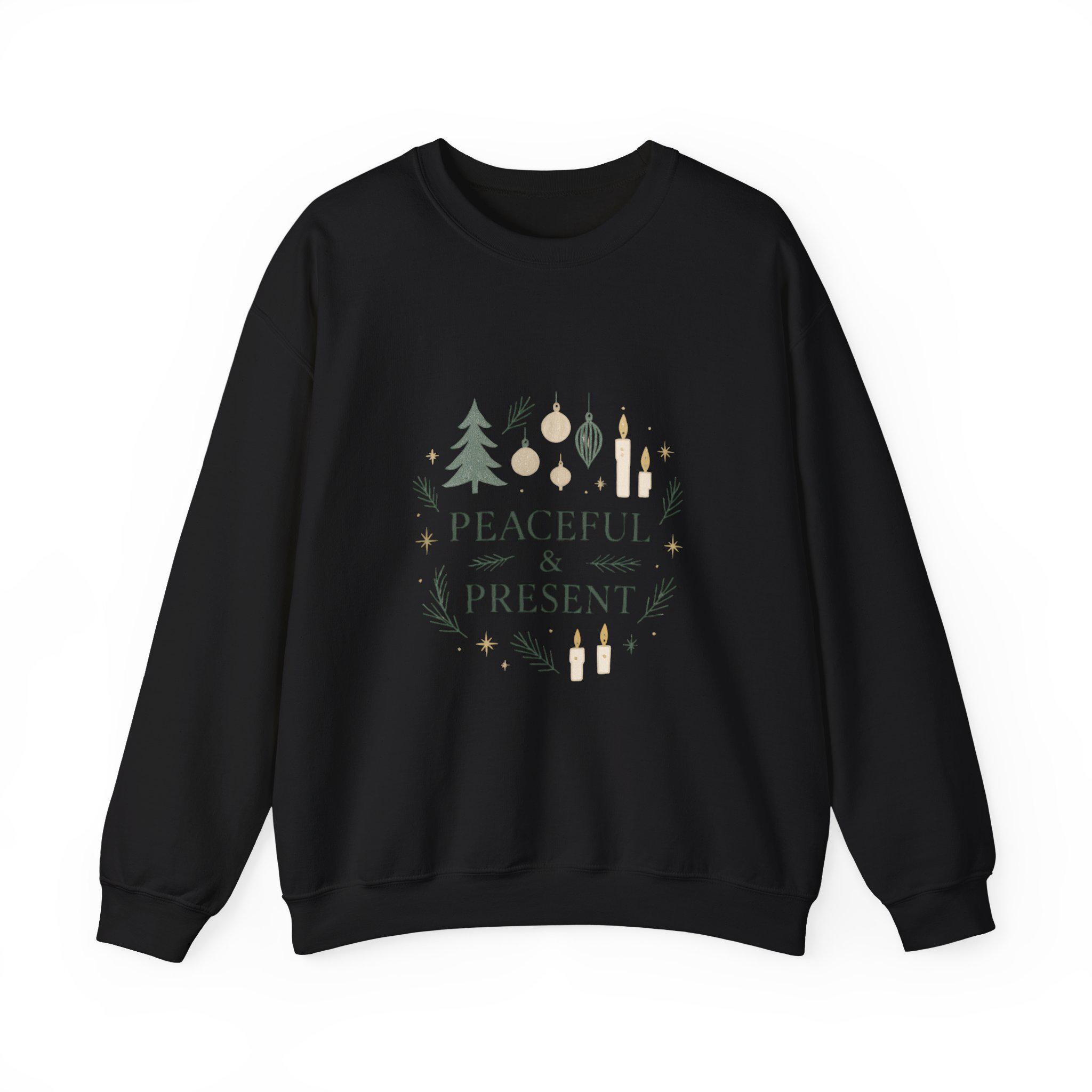 Theme/Features: Minimal holiday greenery and ornaments; “Peaceful & Present” message; soft, neutral palette; embroidered/printed center chest artwork