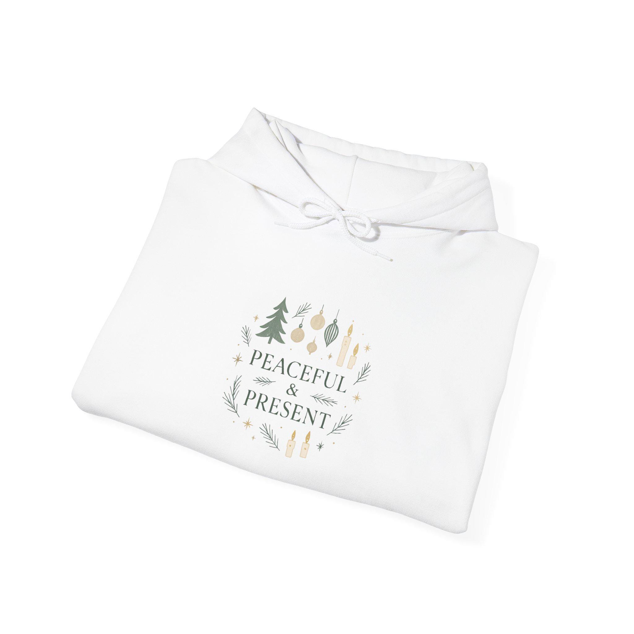 A soft, cozy hoodie that carries a quiet holiday feeling. The front features a gentle, nature-inspired design with tiny trees and ornaments surrounding the words “Peaceful & Present,” printed in muted, earthy tones. Wear it layered over a tee or under a coat for calm, easy warmth during slow winter mornings, tree-trimming evenings, or relaxed visits with family. The roomy kangaroo pocket and double-lined hood add comfort and a lived-in feel — the kind you reach for when you want to pause and breathe. It’s made to feel familiar from the first wear and to tuck you into small, peaceful rituals of the season.