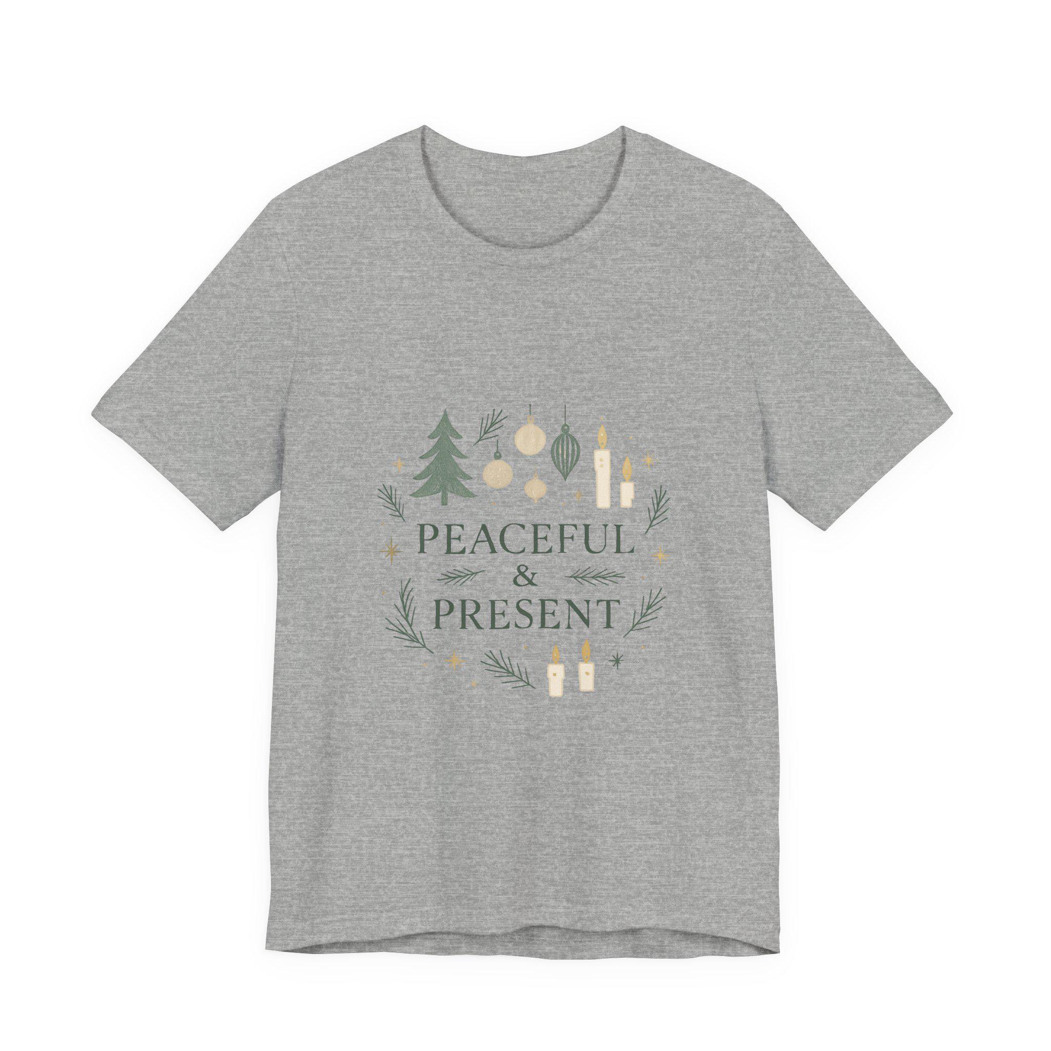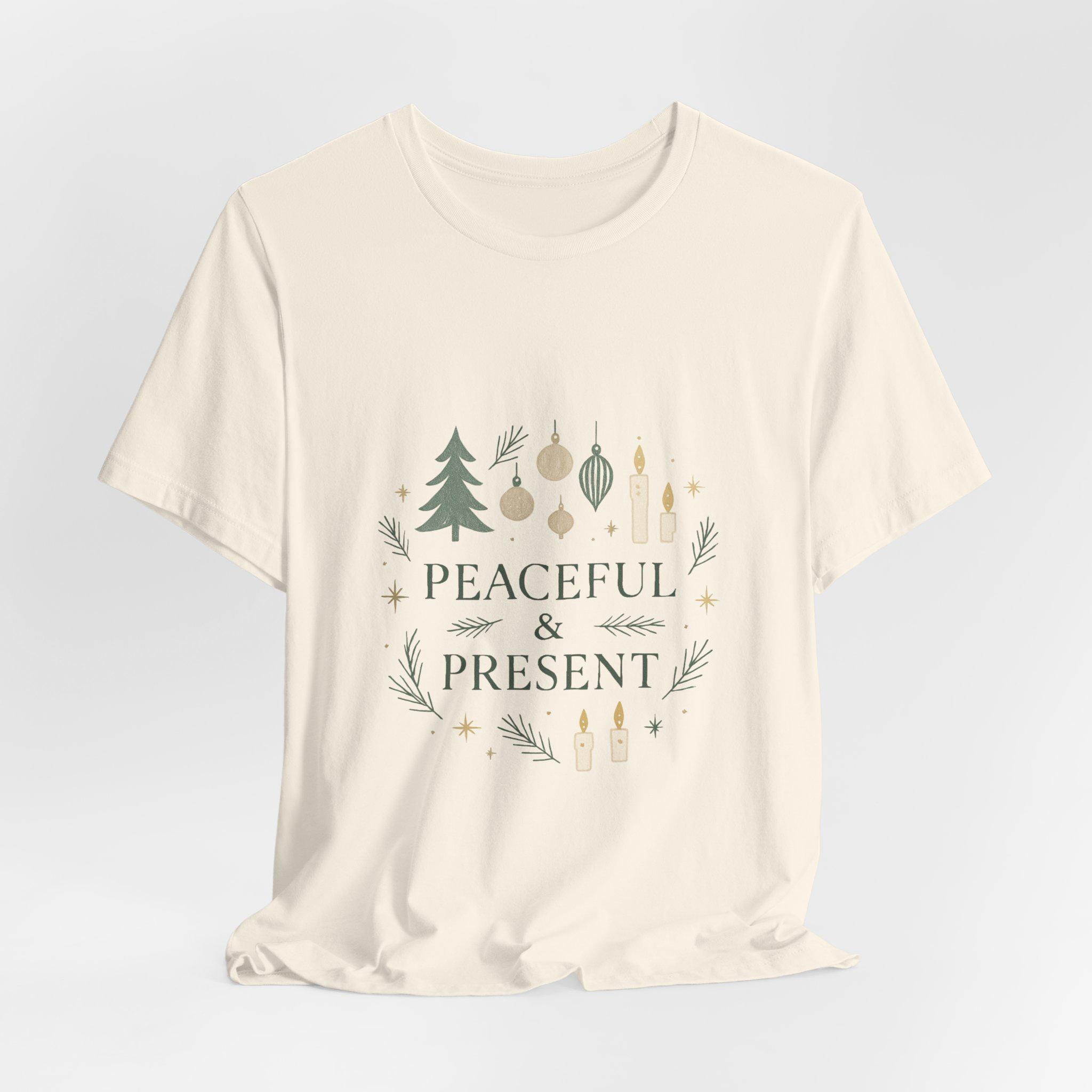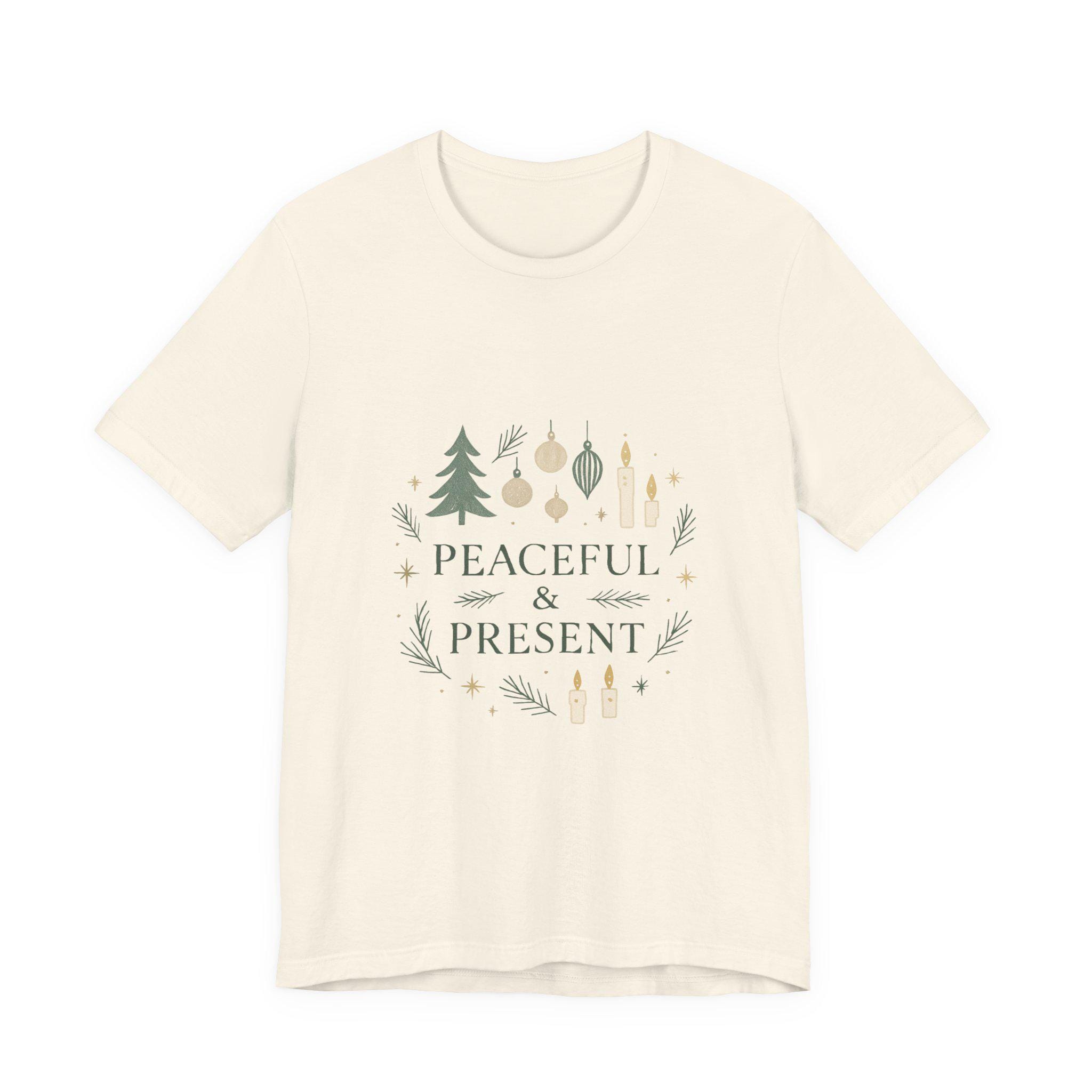 Soft, breathable cotton meets a calm holiday message. This lightweight jersey tee carries a gentle wreath of pine sprigs, ornaments and tiny candle illustrations around the words “Peaceful & Present.” The muted greens and warm neutrals give it a quietly festive look that layers easily under sweaters or wears alone while running errands. Wear it on slow mornings with a mug of coffee, during relaxed family gatherings, or while wrapping gifts — it’s made to keep the mood grounded and cozy without shouting for attention.