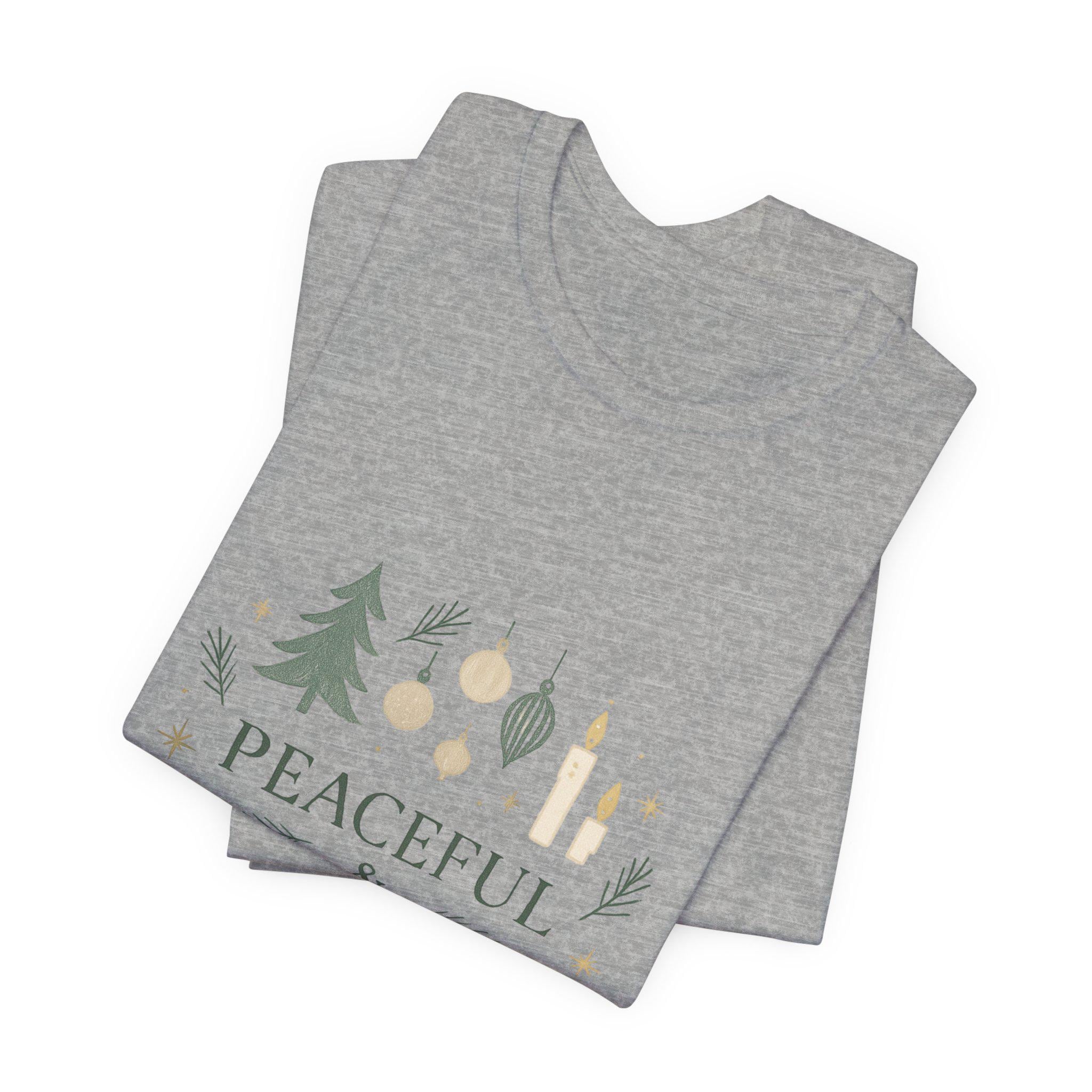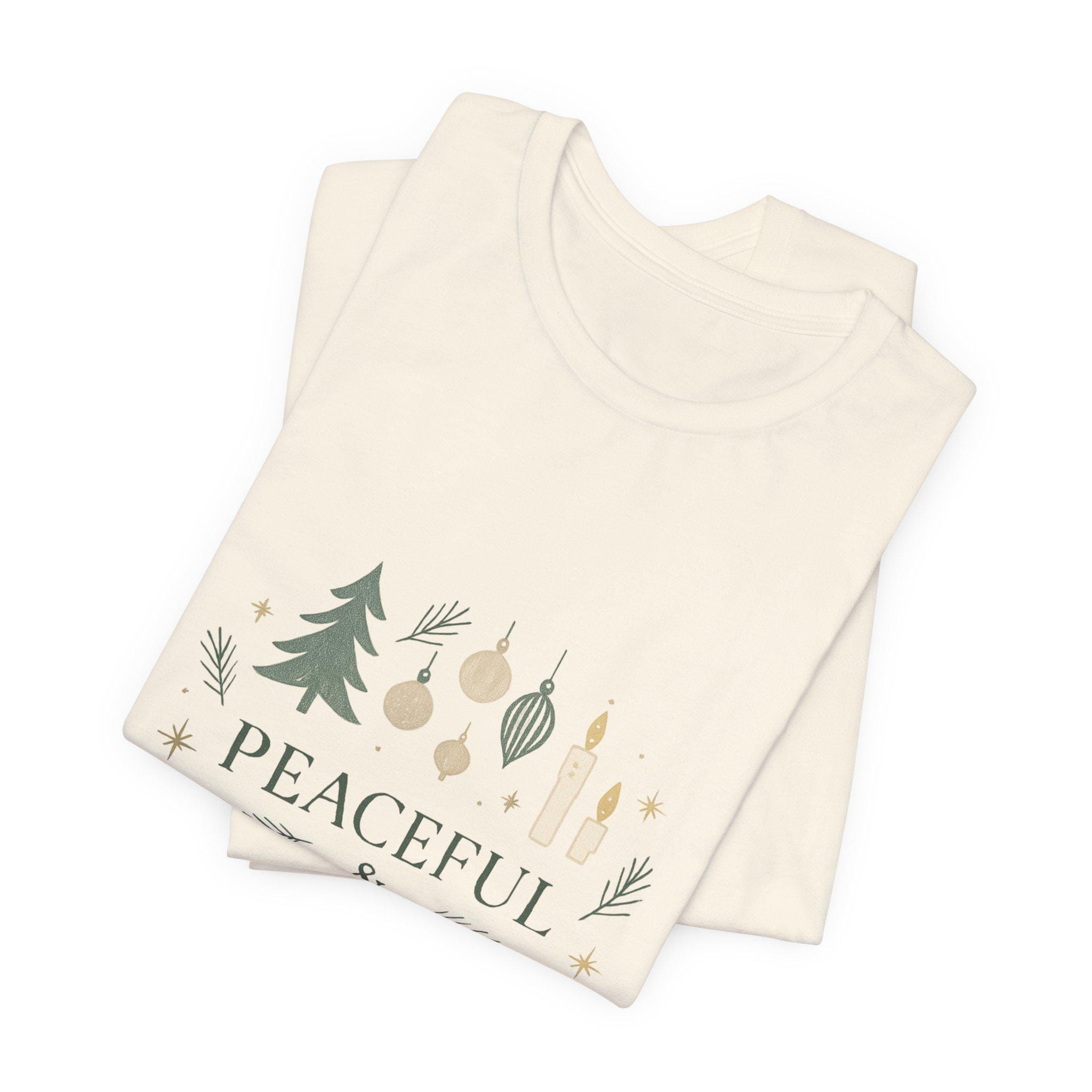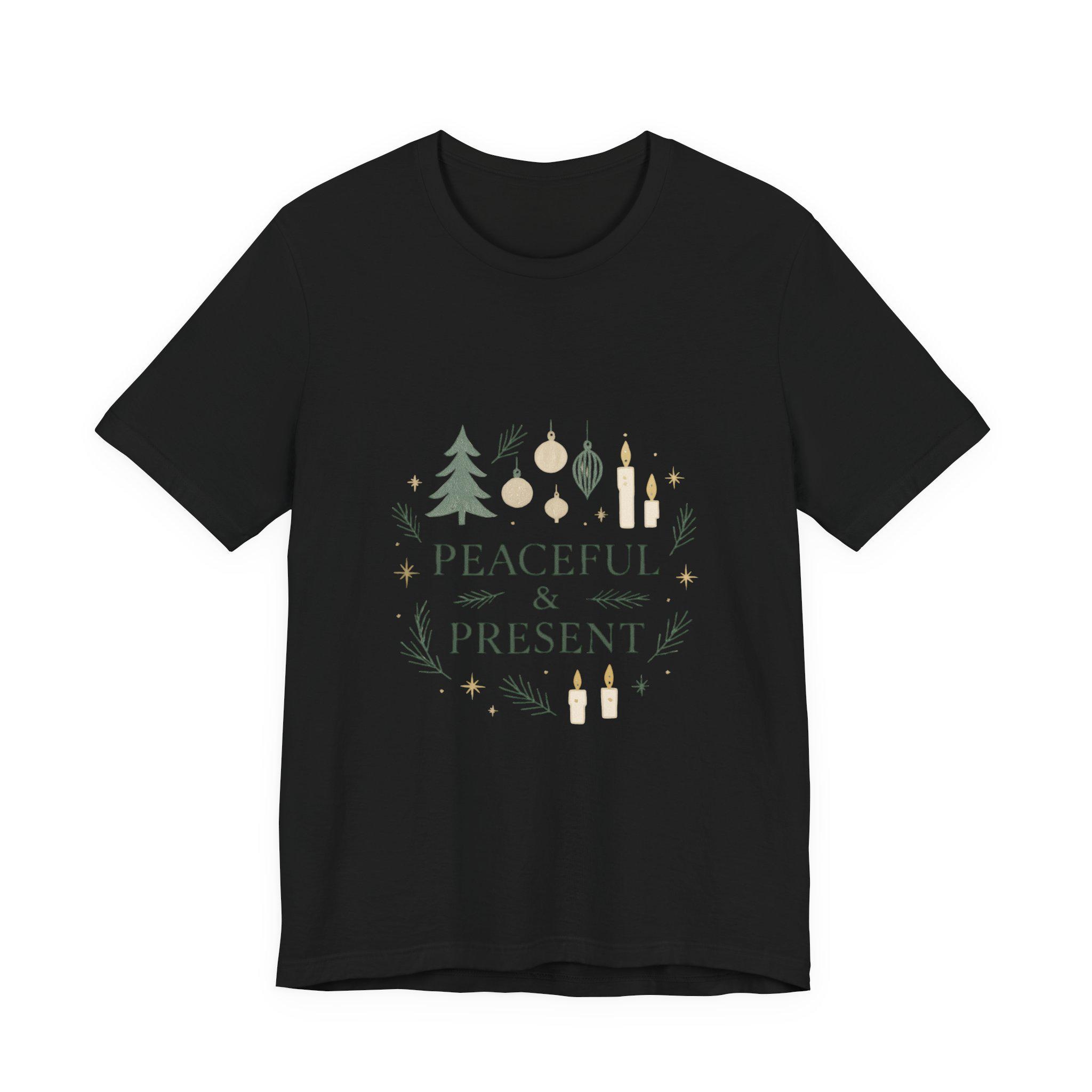Soft, breathable cotton meets a calm holiday message. This lightweight jersey tee carries a gentle wreath of pine sprigs, ornaments and tiny candle illustrations around the words “Peaceful & Present.” The muted greens and warm neutrals give it a quietly festive look that layers easily under sweaters or wears alone while running errands. Wear it on slow mornings with a mug of coffee, during relaxed family gatherings, or while wrapping gifts — it’s made to keep the mood grounded and cozy without shouting for attention.