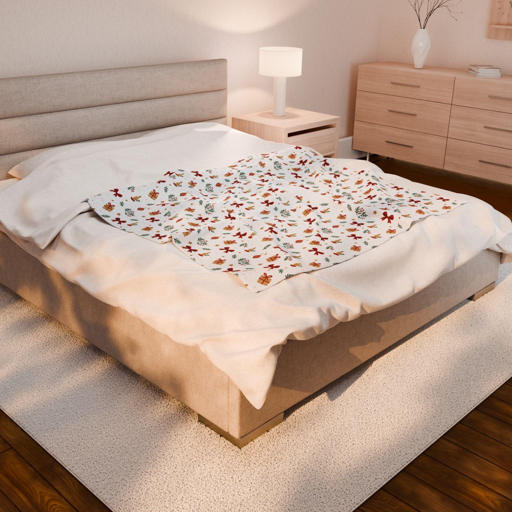 This velveteen plush blanket brings a gentle, cozy touch to quiet evenings and festive mornings. Lightweight yet warm, its ultra-soft surface showcases a delicate pattern of tiny bows, holly sprigs and seasonal accents that feel both cheerful and restrained. Drape it over a reading chair, tuck it around your knees on the couch, or layer it at the foot of a bed to add a subtle holiday look without overwhelming the room. The plush texture invites lingering — slow sips of cocoa, pages turned by lamplight, and laughter shared under its fold.