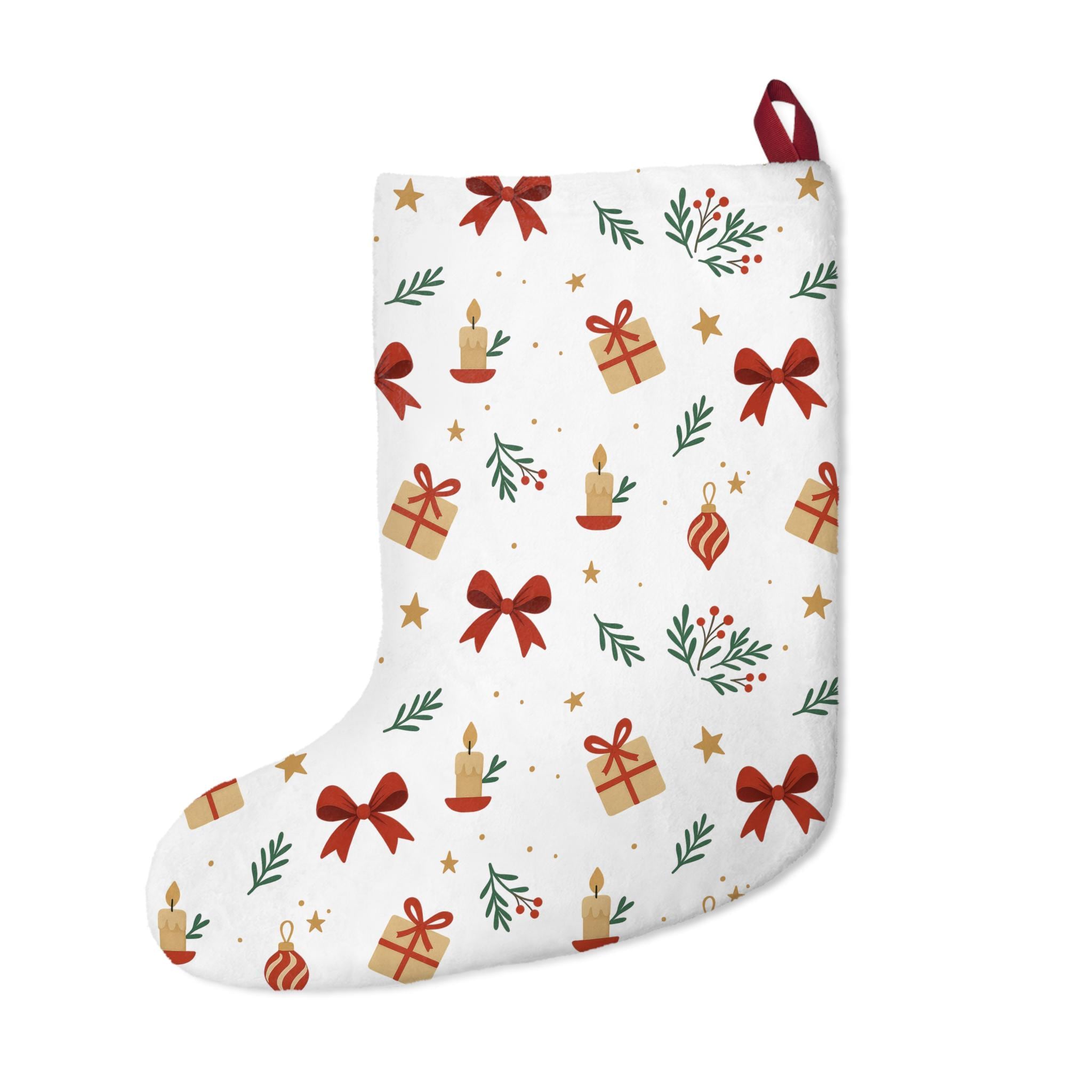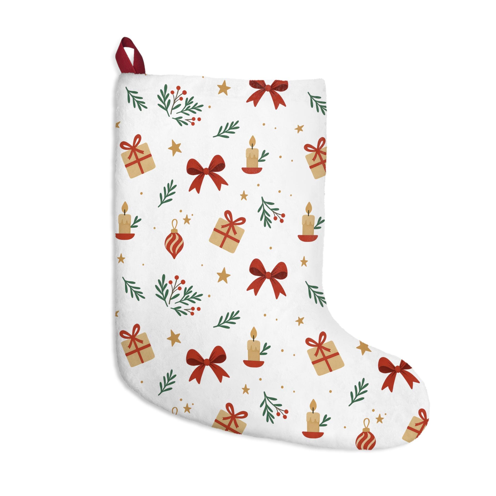 Soft, roomy Christmas stockings embroidered with a cozy holiday pattern — tiny wrapped gifts, ribbon bows, sprigs of greenery, glowing candles and twinkling stars on a snowy white background. The plush polyester fleece feels warm and velvety when you stuff it, while reinforced overlocked seams and a sturdy 3" twill hanging loop keep the stocking looking neat year after year. These stockings arrive pre-constructed and ready to hang on a mantel or stair rail, bringing a gentle, nostalgic charm to a family’s seasonal décor. Made in the USA from globally sourced parts, they blend durability with a hand-crafted, homey aesthetic that fits into quiet mornings of cocoa, stocking-stuffing rituals, and family gift exchanges.