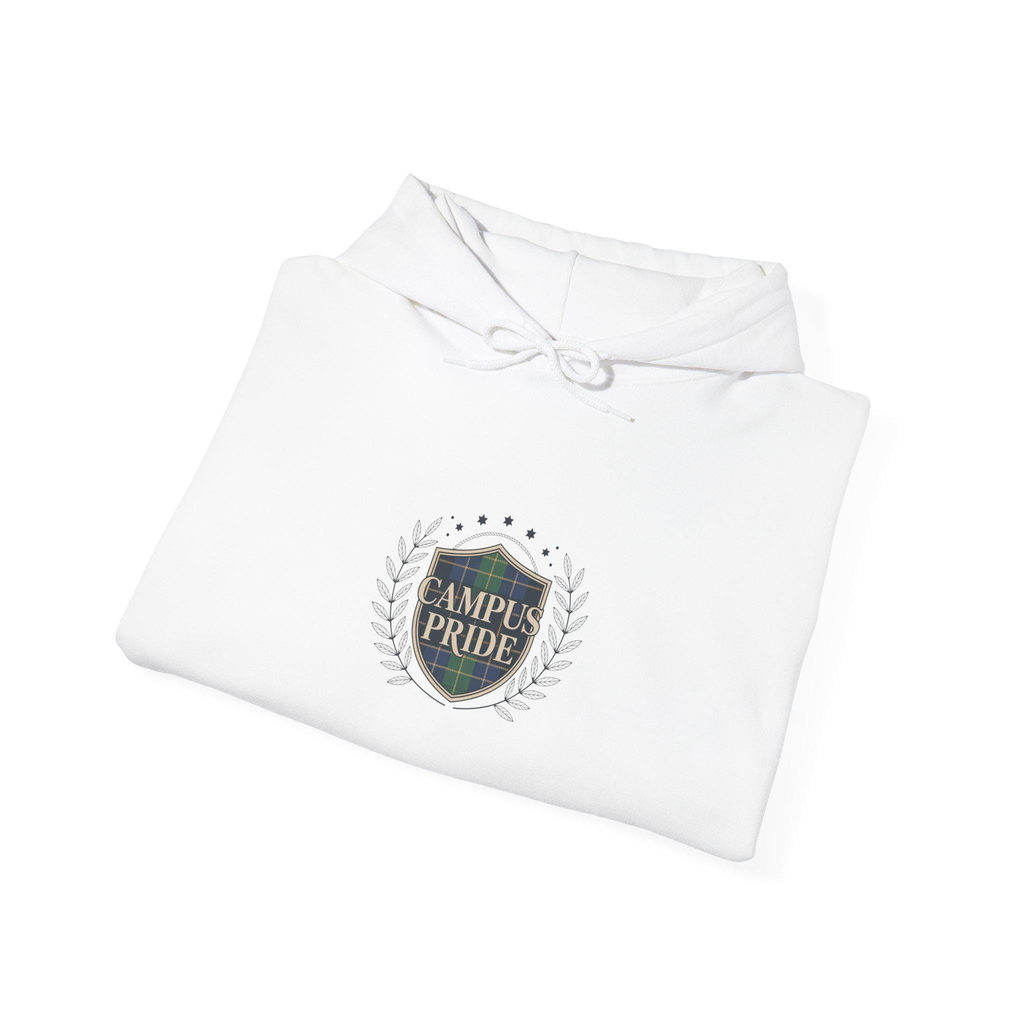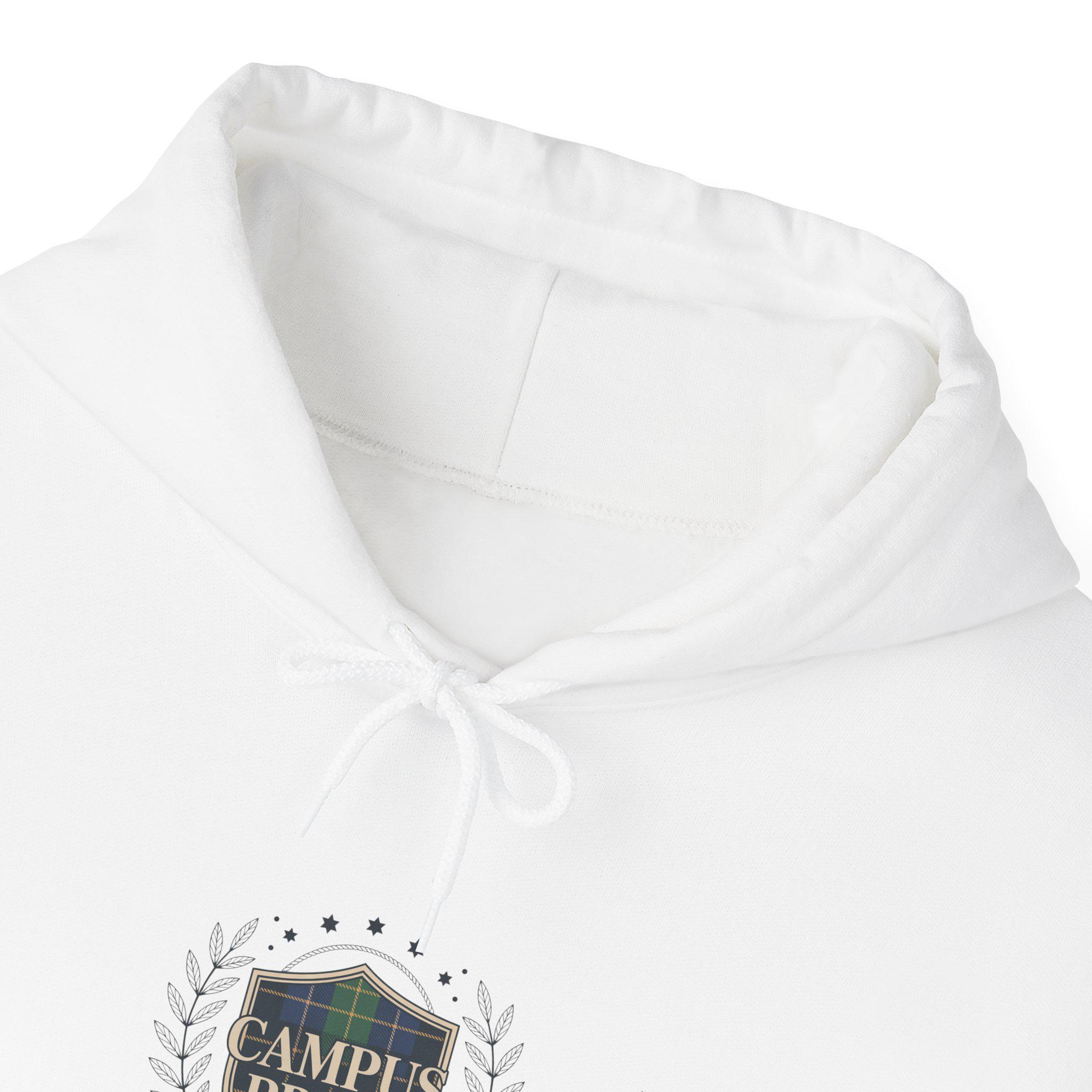 Heritage-inspired embroidered crest sweatshirt blending preppy collegiate motifs with a pared-back, campus-core aesthetic. The small crest features tartan-like panels and a structured laurel, rendered to read as an academic emblem without referencing any real institution. Subtle, neutral palette and clean layout make this hooded sweatshirt a wearable nod to classic prep styling for cool-weather layering.
