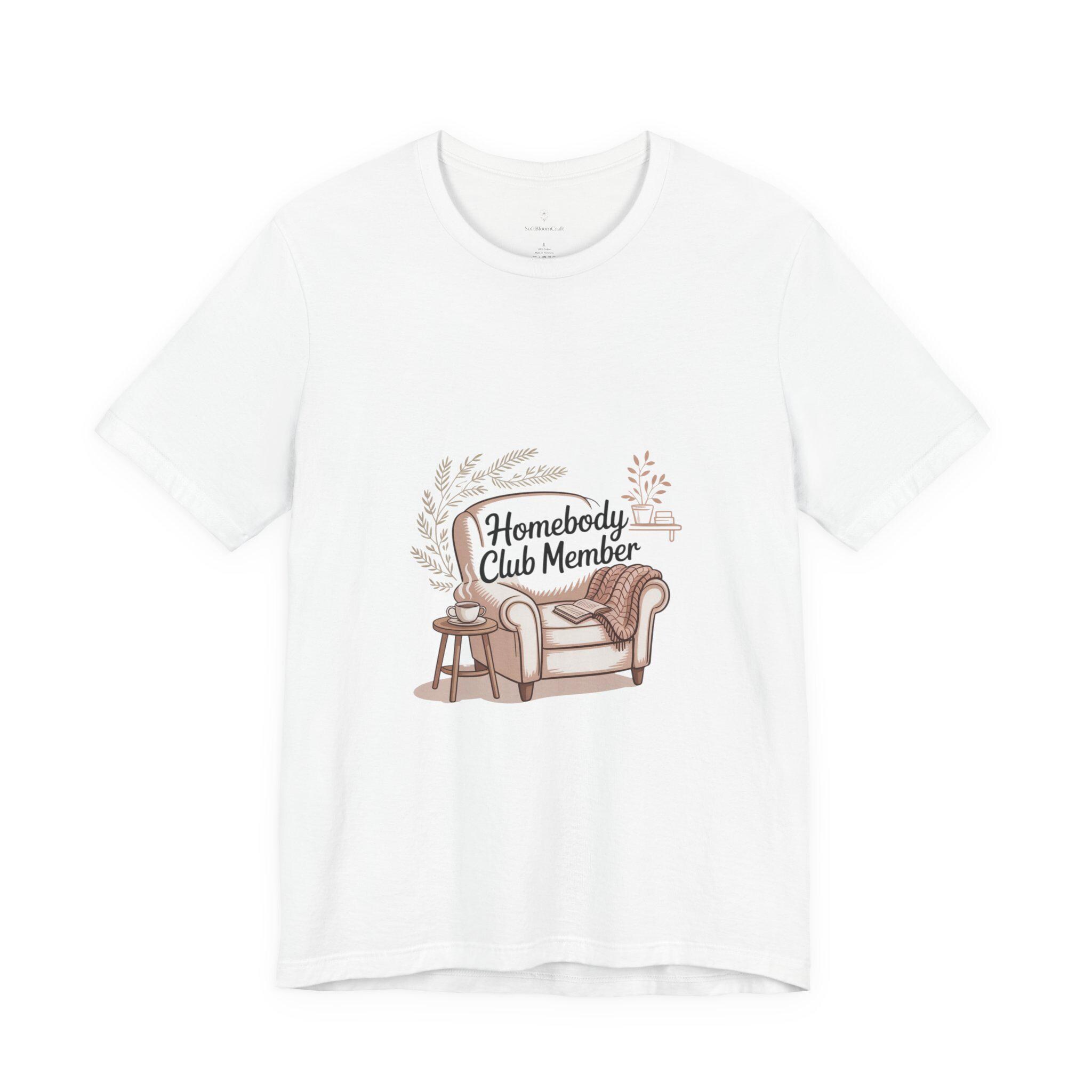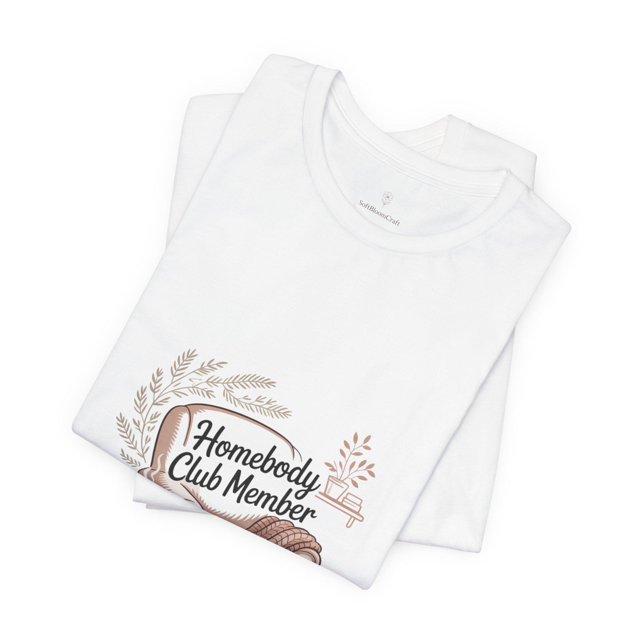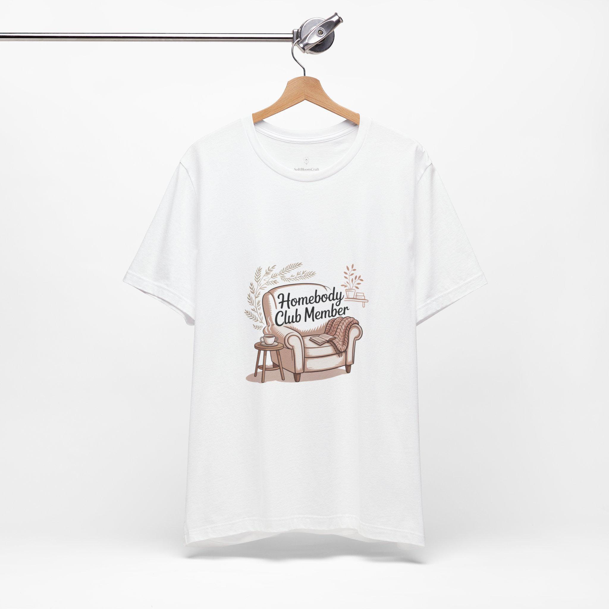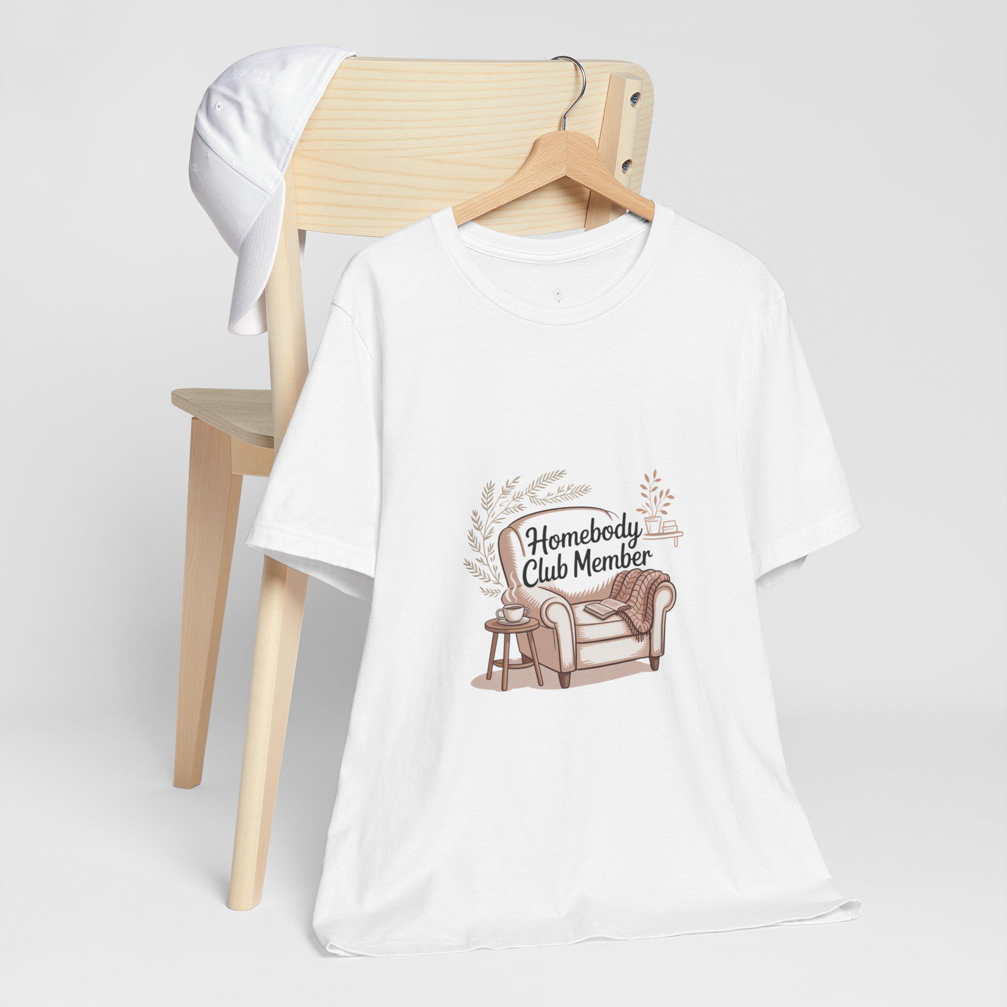 ‘Homebody Club Member’ tee—soft hand-drawn couch, blanket and cat-accented wreath in warm muted tones that reads like a quiet membership badge for cozy solo holidays. The artwork channels introvert-holiday and hygge vibes with gentle script and a simple, intimate layout designed to feel like a comforting night in. Lightweight cotton fabric and a relaxed retail fit make it easy to wear layered at home for low-key winter evenings or slow mornings curled up with a book.