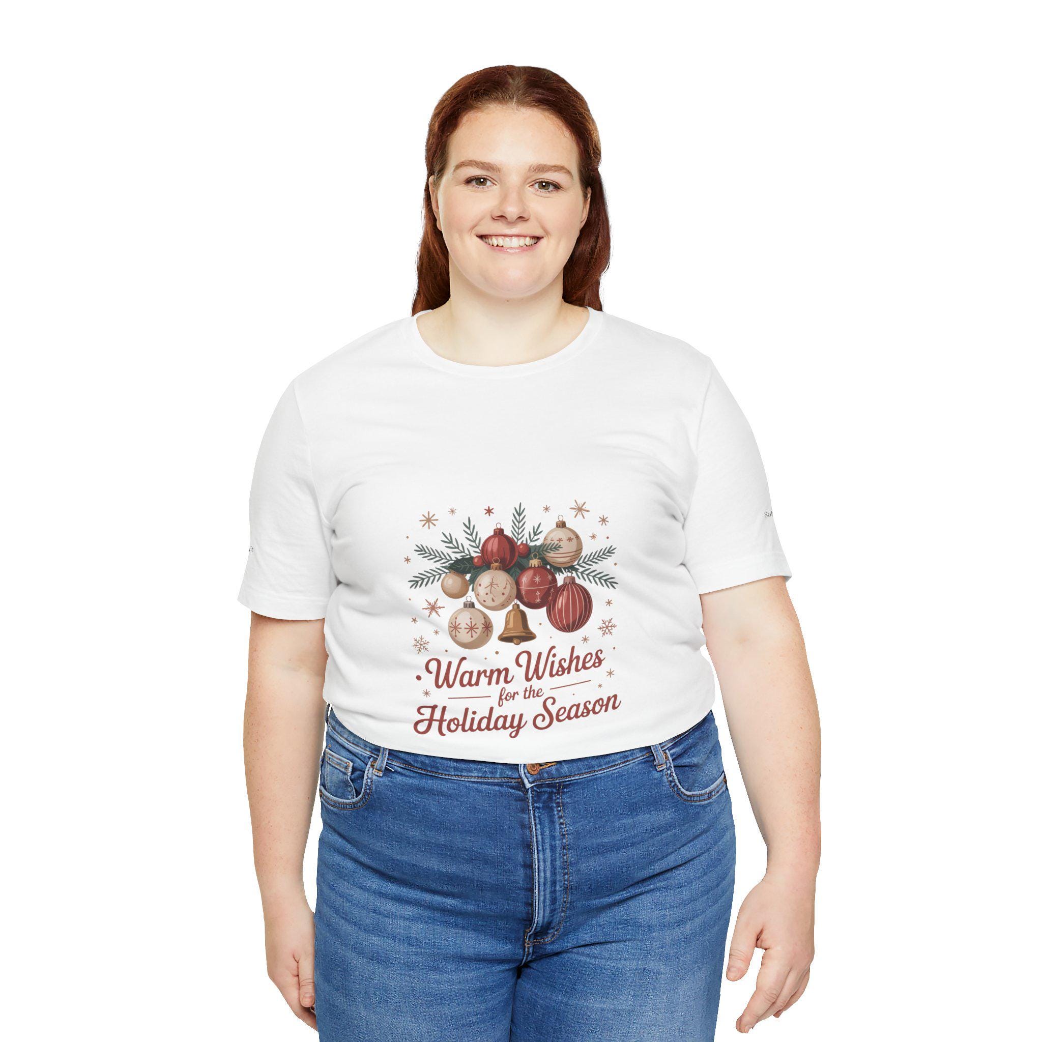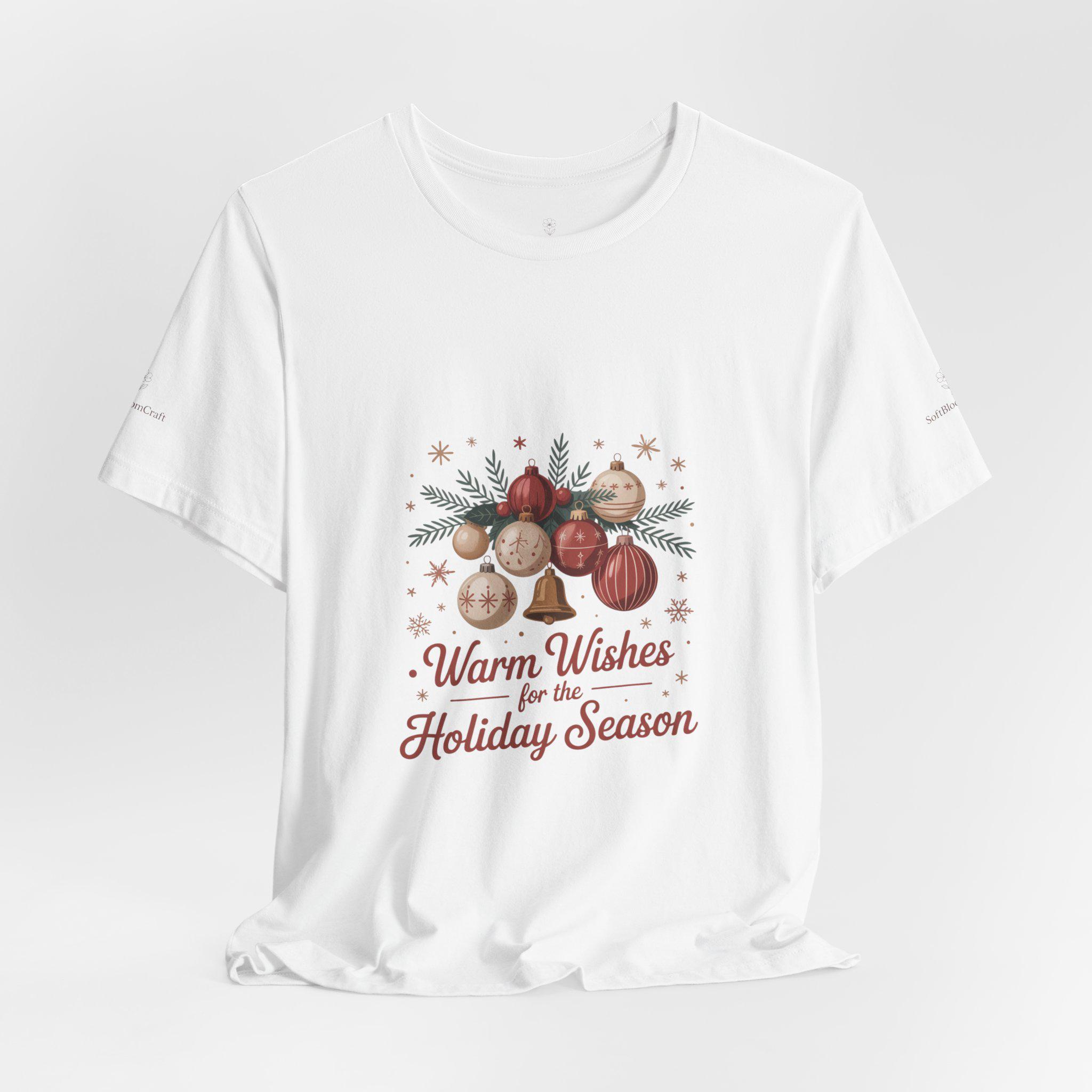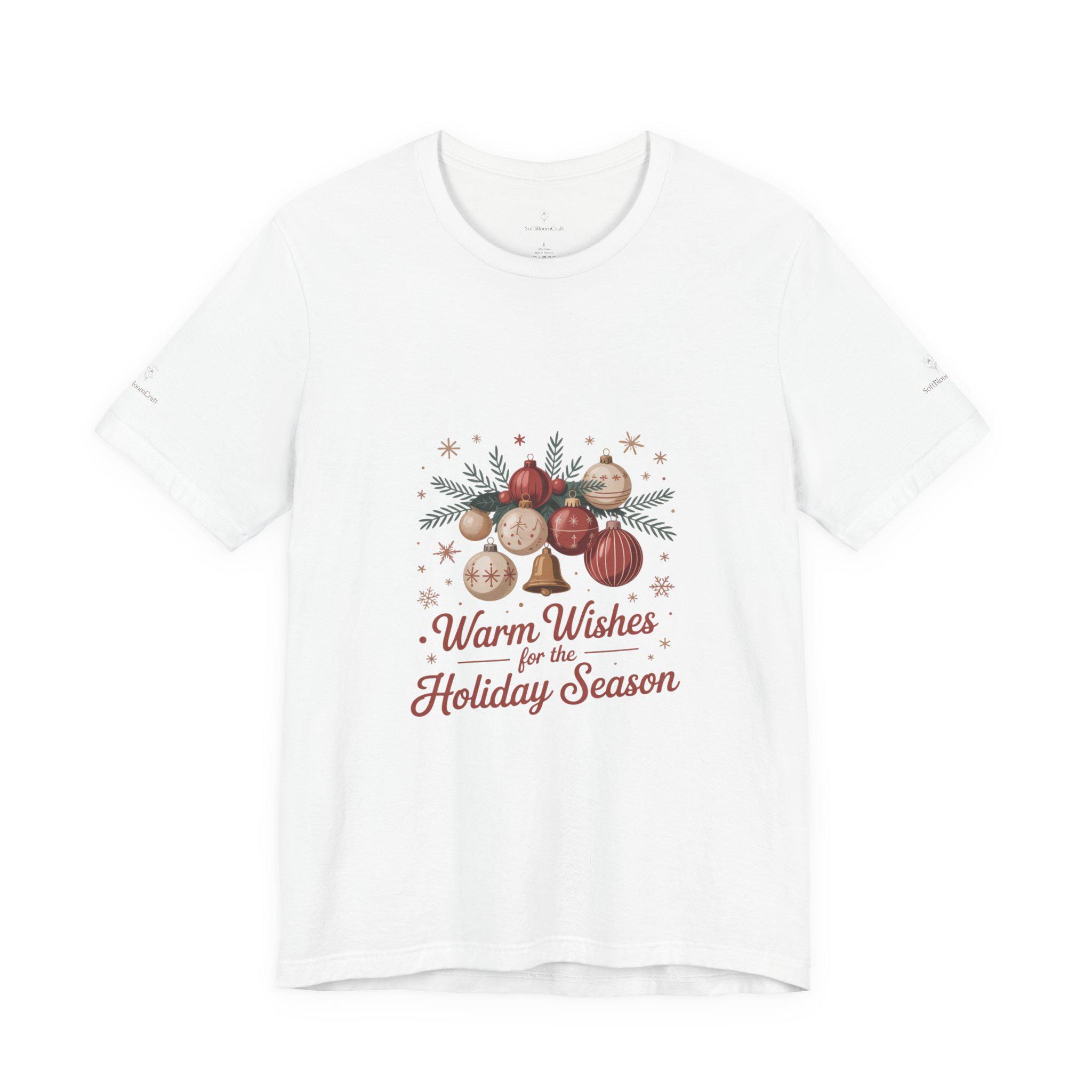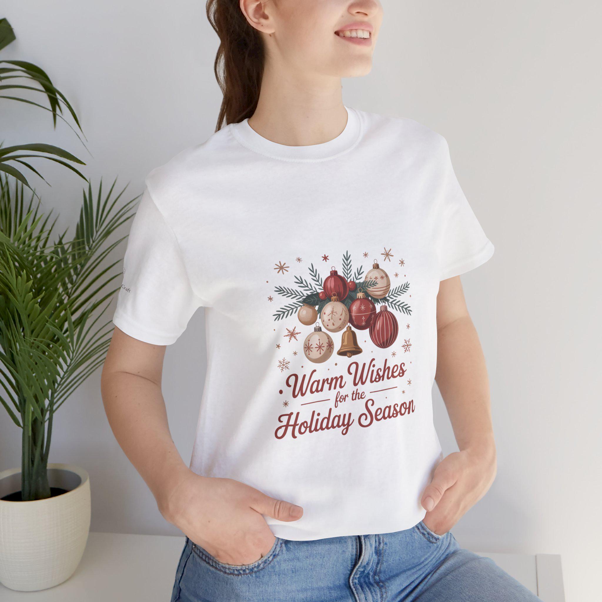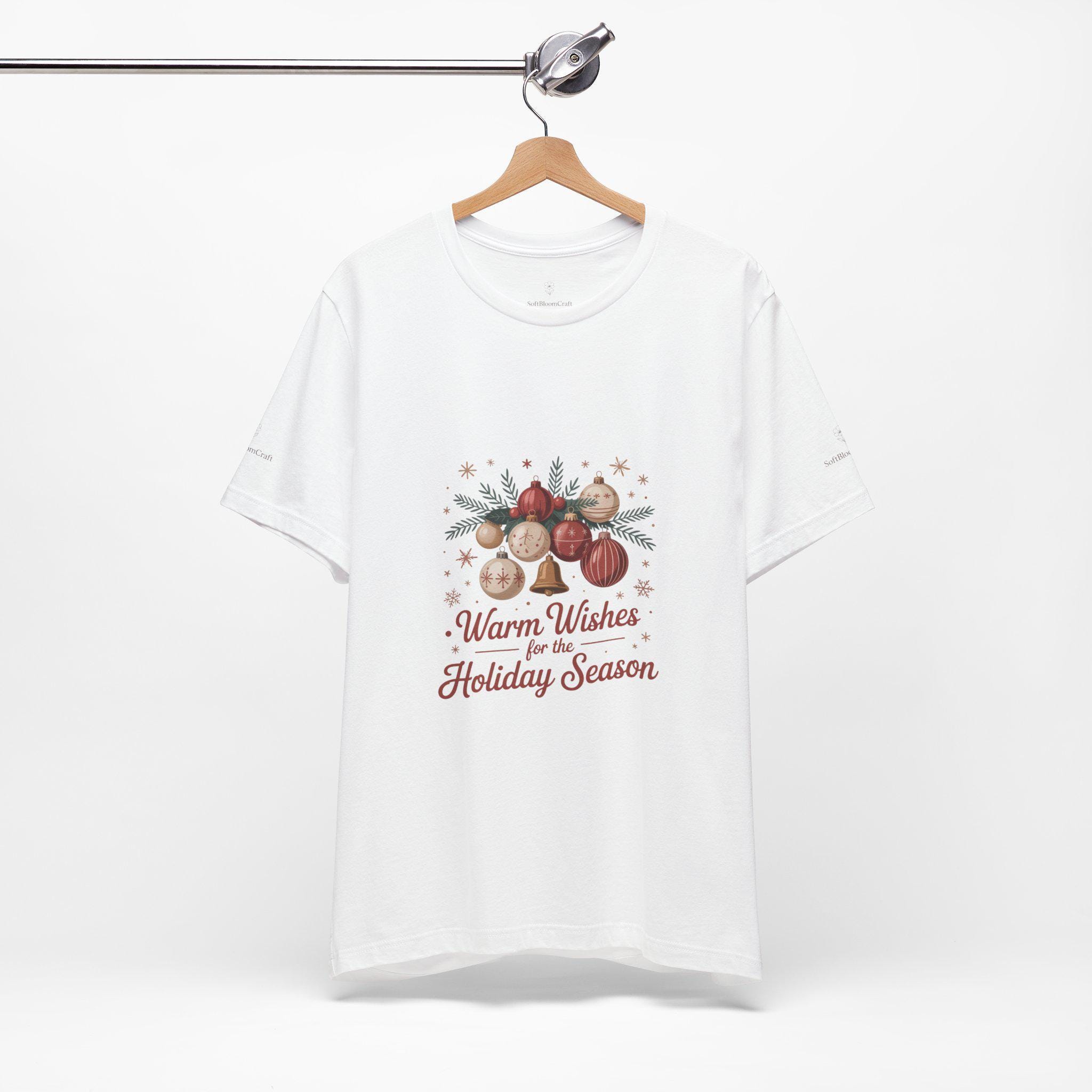 Warm, postcard-style holiday artwork rendered in muted, sepia-leaning tones with vintage ornaments and period-inspired script—evoking 1920s–50s Christmas correspondence. The design’s grainy texture and classic serif-script caption read like an old-fashioned holiday card, suited to nostalgia-minded shoppers who collect retro seasonal imagery. Printed on a lightweight unisex jersey tee, the motif works as an image-first, wearable keepsake for quiet, sentimental celebrations.