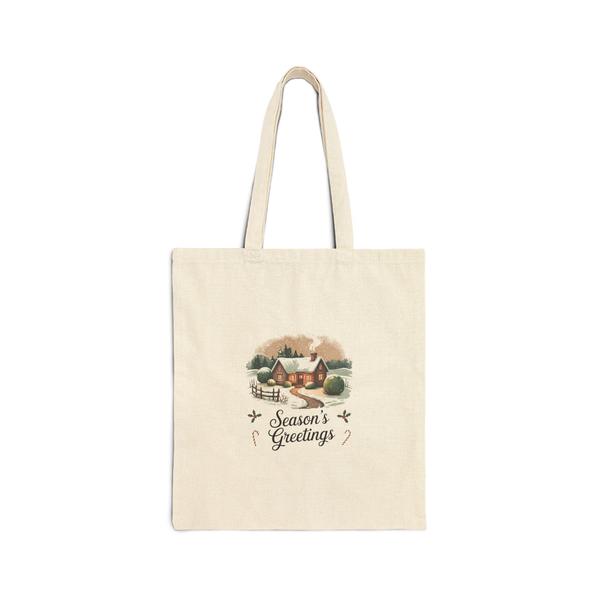 Seasonal postcard-style artwork printed on natural cotton canvas, evoking the muted tones and grain of 1920s–50s holiday cards. The small, centered illustration shows a snowy cottage scene with soft sepia-leaning colors and period serif script reading a short greeting, delivering a quiet, nostalgic holiday mood that fits retro holiday card design and vintage Christmas postcard trends. Lightweight enough for everyday errands yet collectible in aesthetic, it brings old-fashioned xmas charm to market runs, library visits, or seasonal outings.