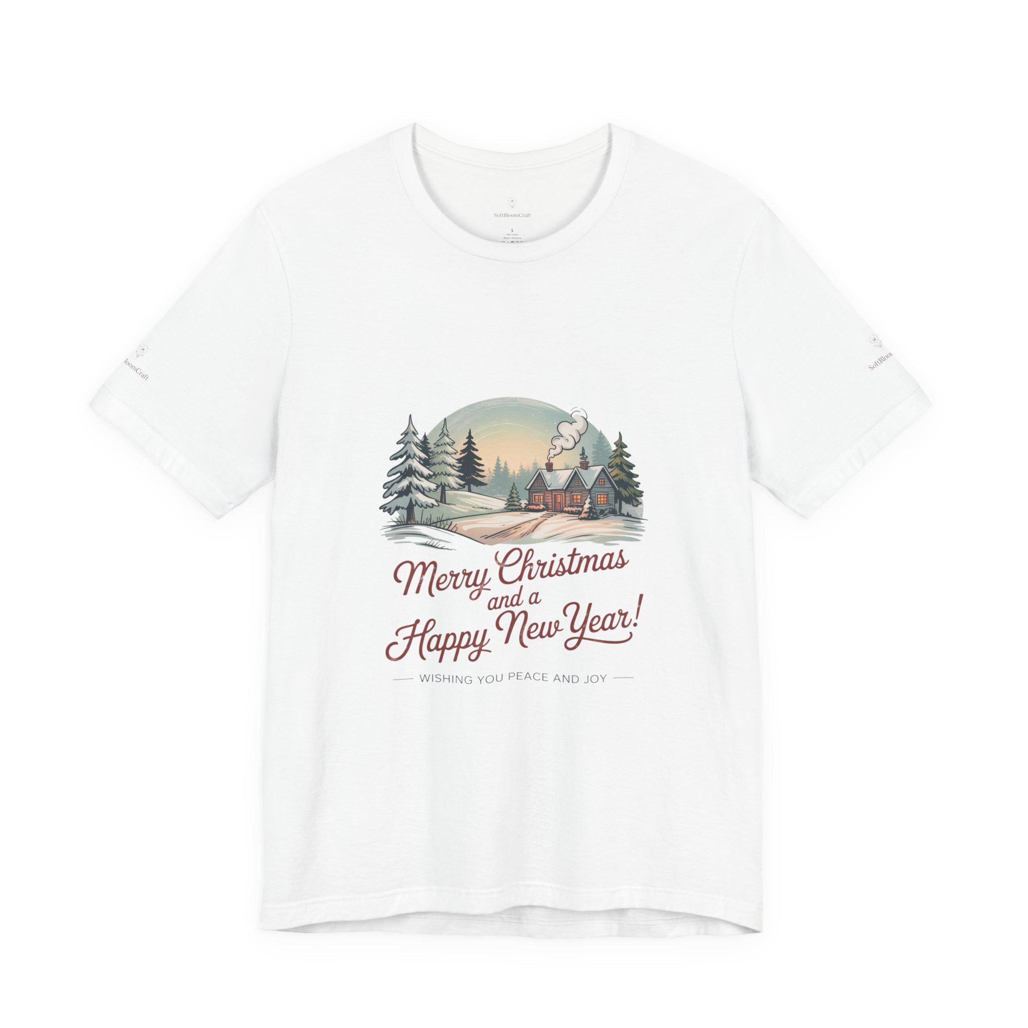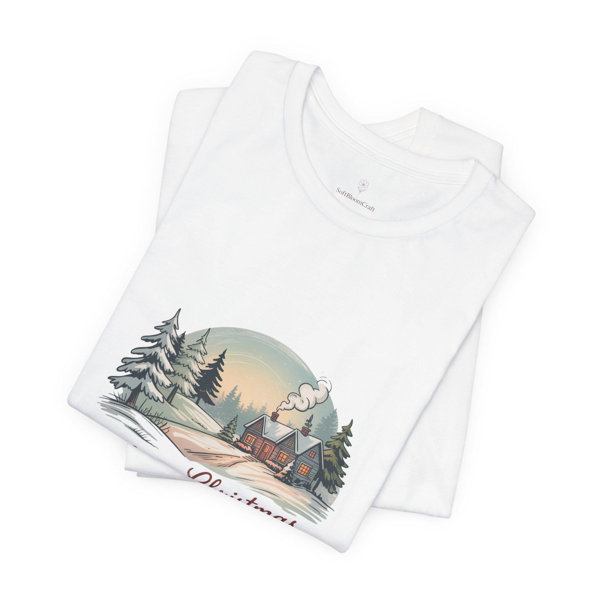 A soft, vintage-postcard style tee featuring a muted, sepia-tinged winter scene — a smoke-topped cabin framed by evergreen silhouettes and retro script greeting. The artwork uses faded tones and subtle grain to evoke 1920s–50s holiday postcards, printed on a lightweight, breathable jersey that layers easily. This nod to old-fashioned xmas aesthetics fits collectors and nostalgic shoppers who appreciate wearable seasonal imagery with a gentle, analog feel.