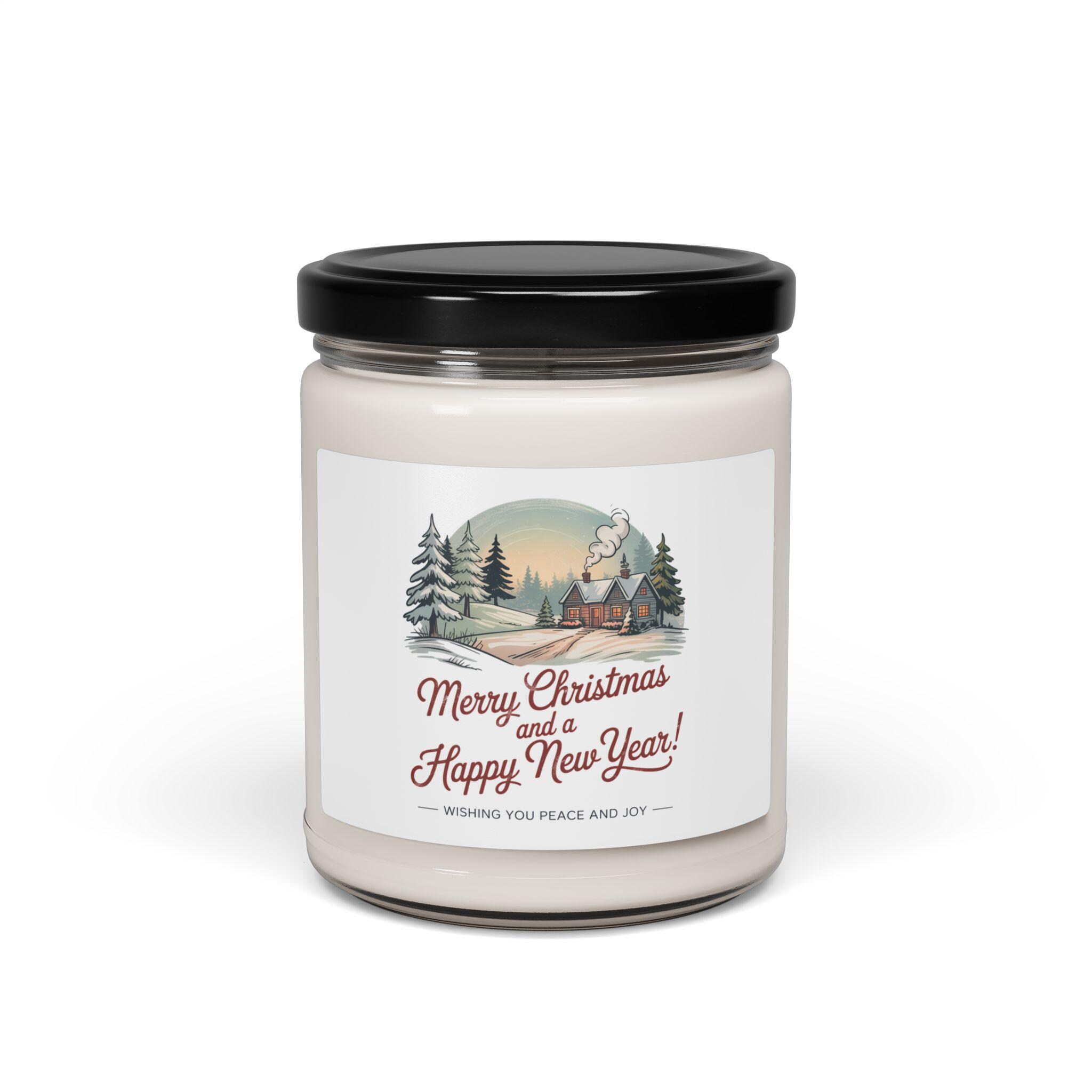 A 9oz soy candle wrapped in a muted, vintage-postcard label that evokes 1920s–50s holiday correspondence. The artwork shows a small snowy cabin among evergreen trees with a faded sunlit sky and period serif/script greetings, creating an old-fashioned Christmas postcard mood. Scent options range from warm spice to clean linen and seaworthy accords so shoppers can pair a nostalgic look with a fragrance that fits their holiday table or mantel.