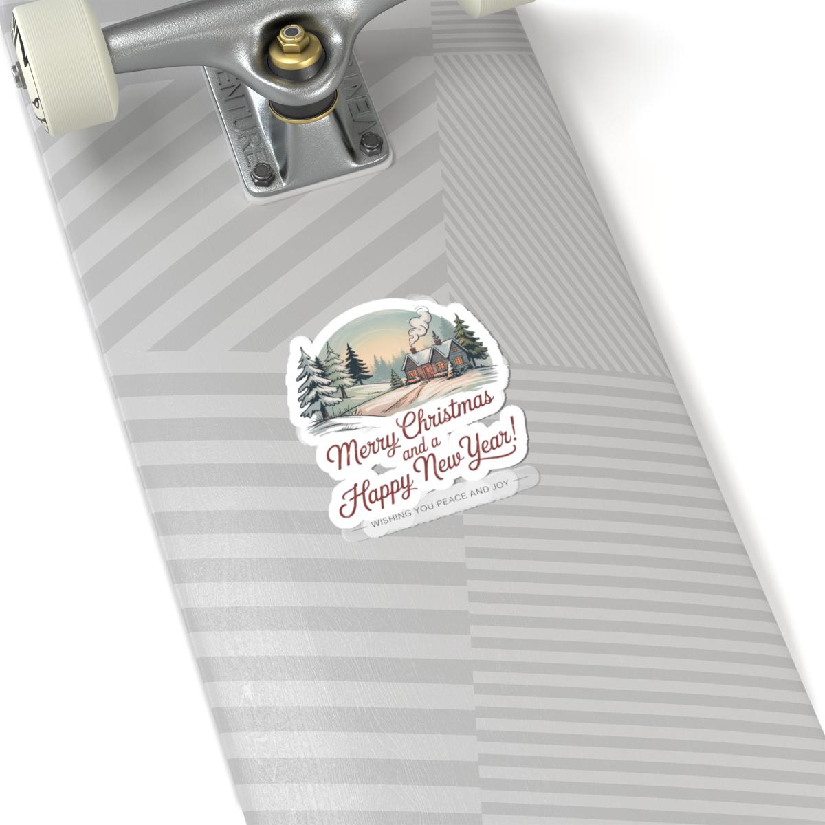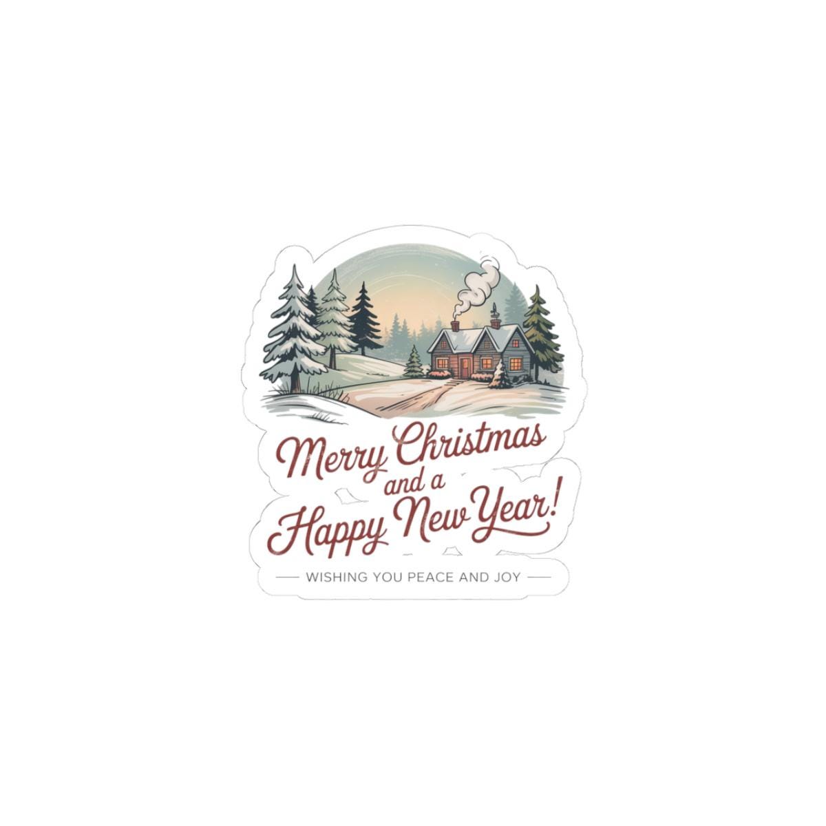 A kiss-cut vinyl sticker capturing a vintage postcard holiday scene: a snowy cabin framed by evergreen silhouettes, muted sepia-green palette, and retro script greeting that reads like a 1940s holiday card. The artwork’s grainy, analog look and period serif/script pairing evoke old-fashioned xmas postcards for collectors and nostalgia lovers. Easy to apply on laptops, journals, and smooth indoor surfaces to add a cozy, collectible seasonal accent that fits the Vintage Postcard Christmas trend.