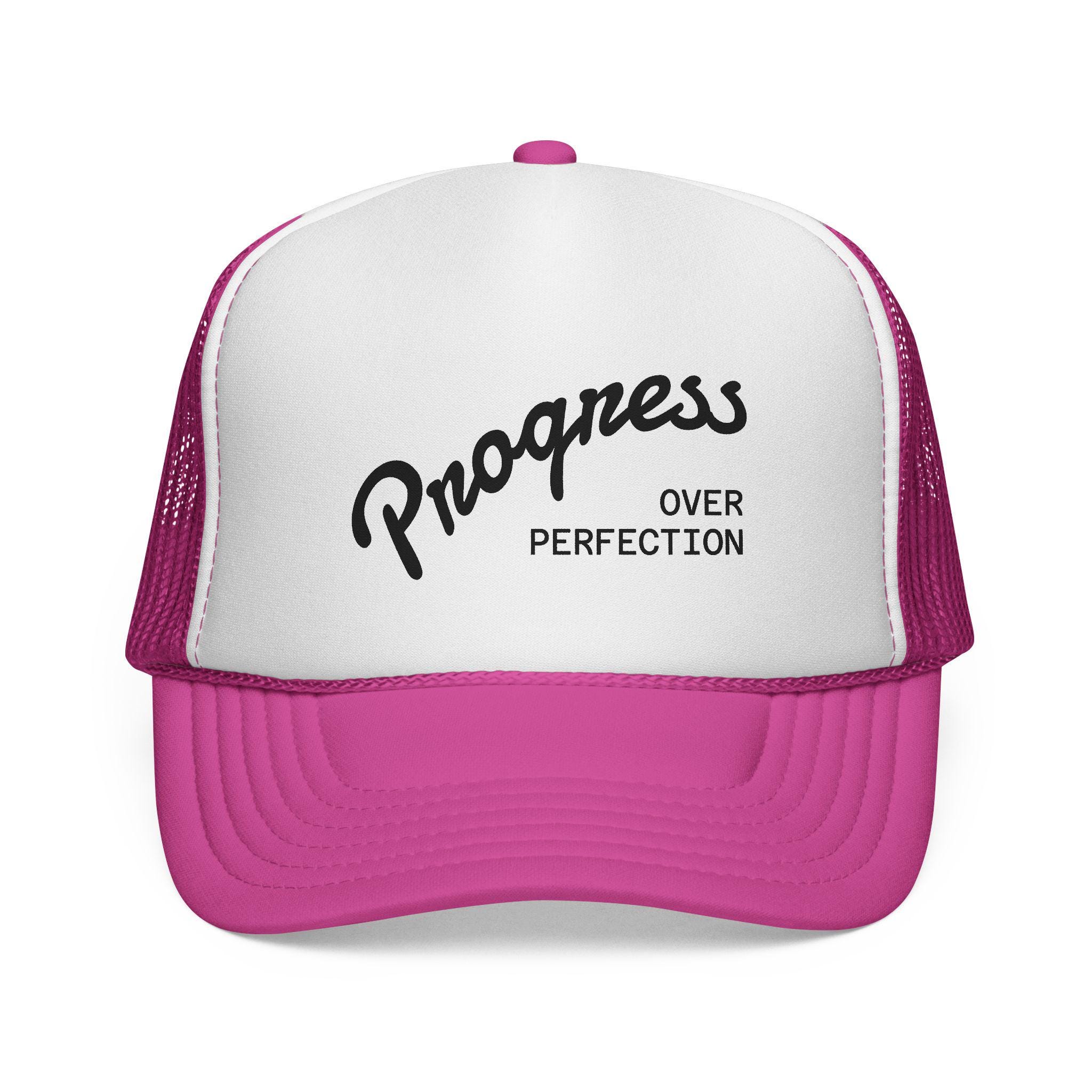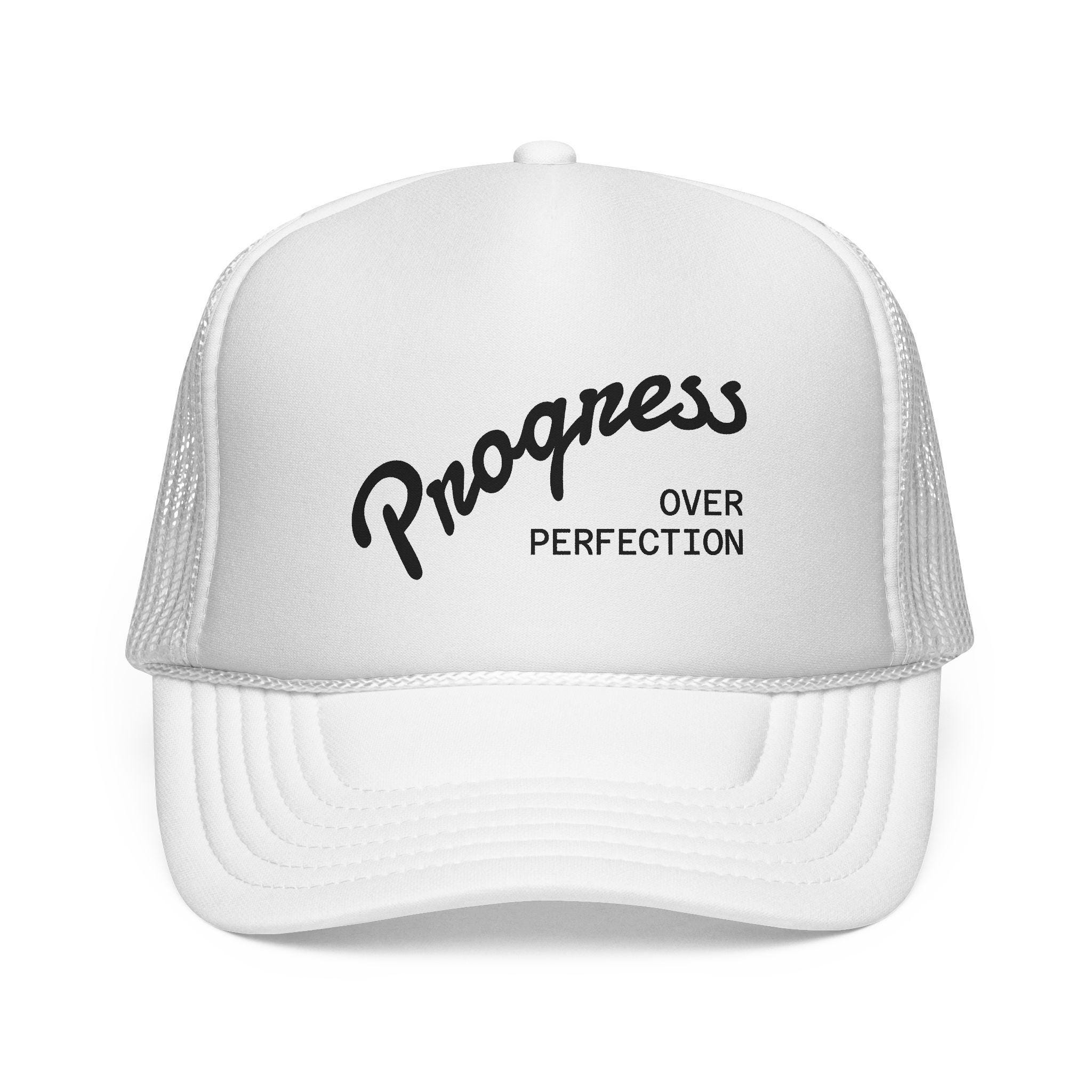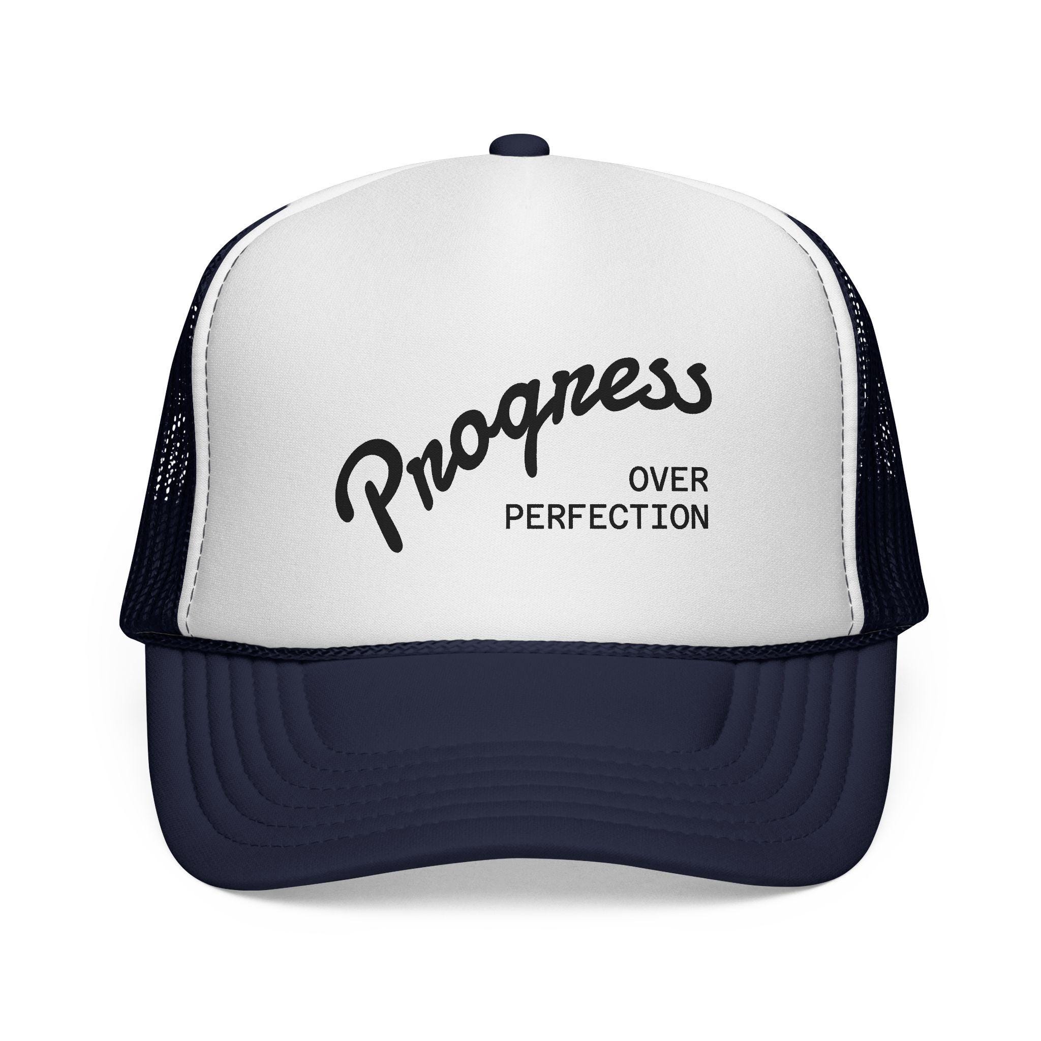 Lightweight trucker cap built for everyday wear and forward motion. The bold embroidered message on the foam front reads like a quiet reminder — progress matters more than perfection — while the ventilated mesh back keeps you cool on long days outside. It settles in quickly once worn: the foam front softens, the visor relaxes, and the color stays vivid through sun and time. Wear it on morning runs, road trips, or while tackling a workshop project; it’s the kind of cap that feels like encouragement rather than decoration.