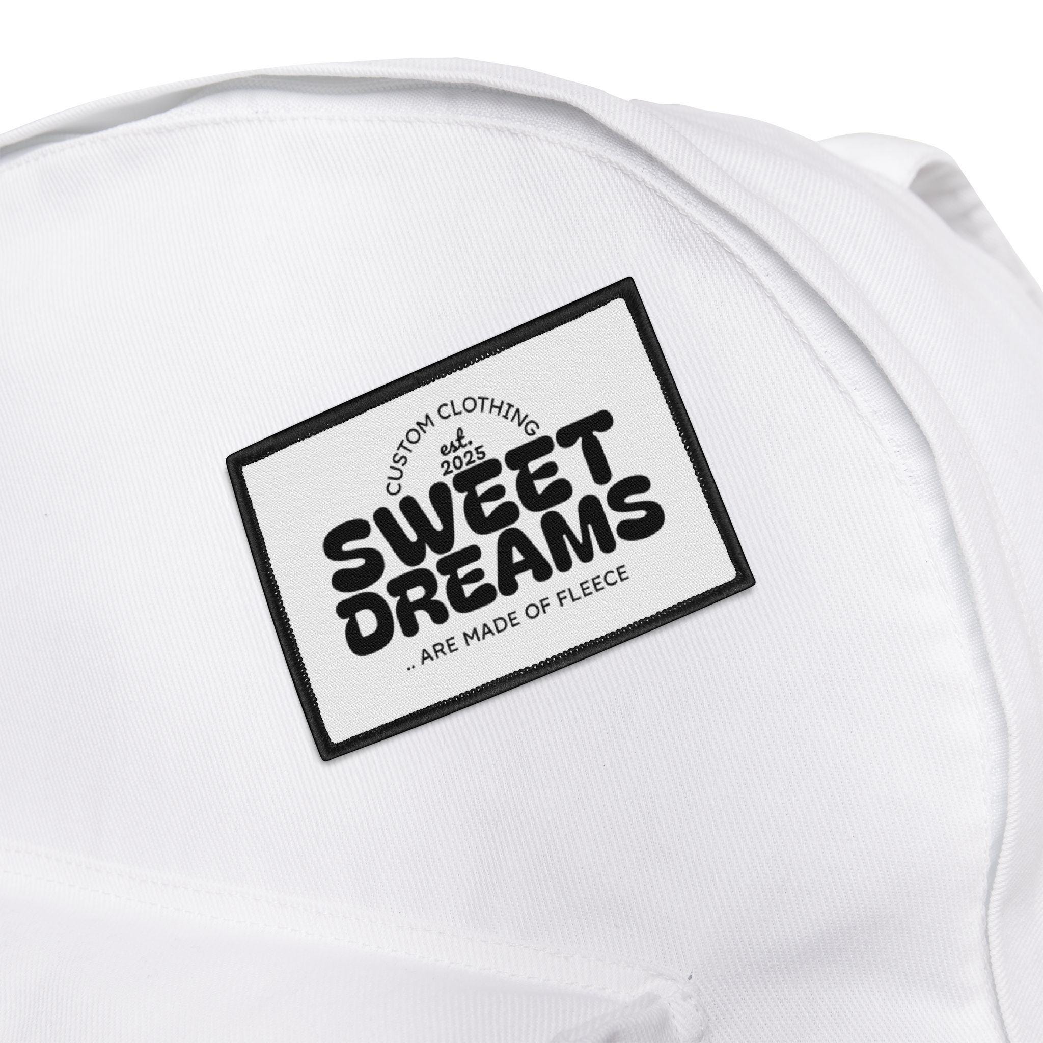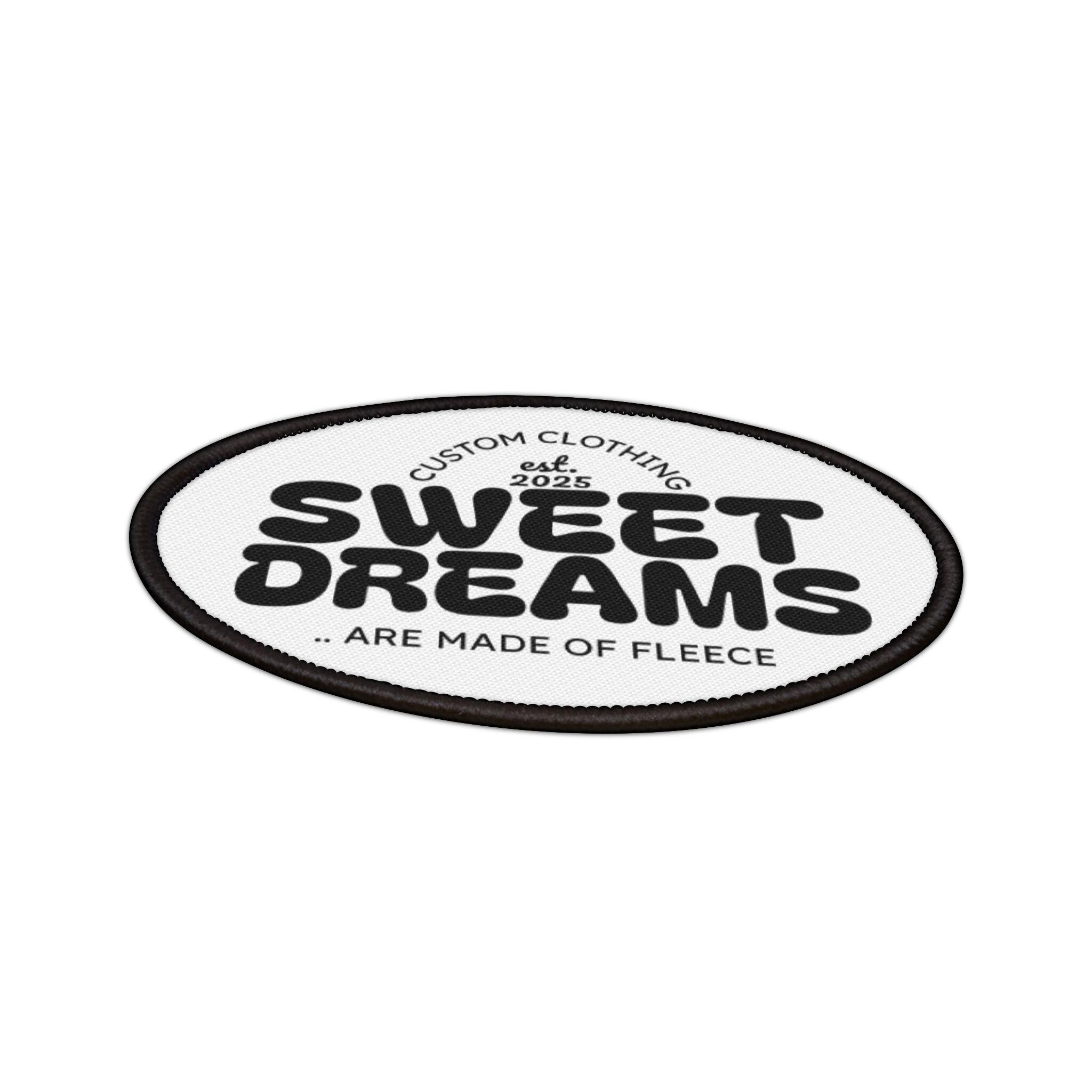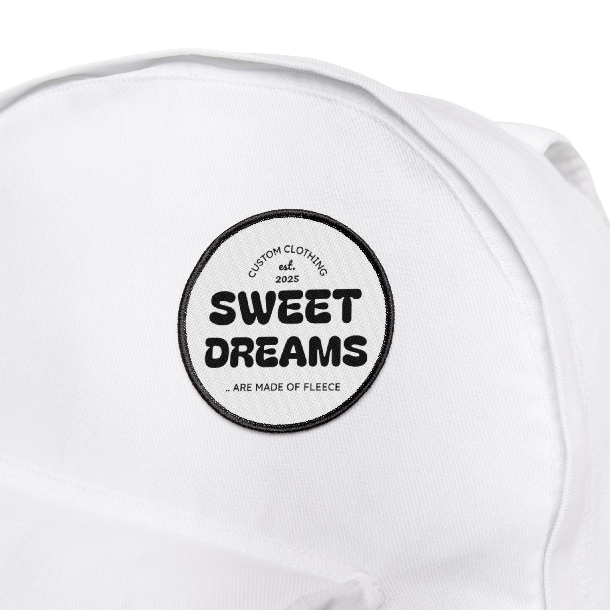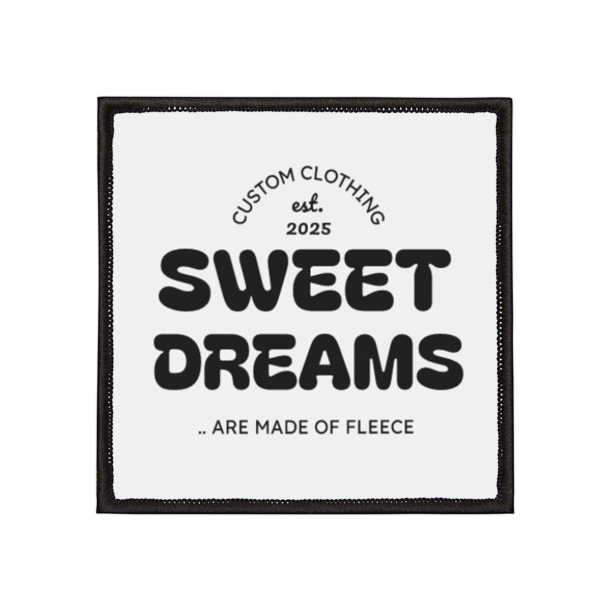 A crisp, embroidered-feel iron-on patch that reads “SWEET DREAMS” in bold, vintage-inspired type against a clean white background. The patch’s black stitched border gives it a defined, slightly retro look that stands out on denim jackets, backpacks, beanies, or canvas totes. Lightweight and sturdy polyester construction holds its shape and resists fraying, while the iron-on backing makes it simple to attach at home. The design brings a calm, slightly nostalgic vibe — a small statement piece that adds personality and quiet optimism to everyday wear or cozy evening gear.