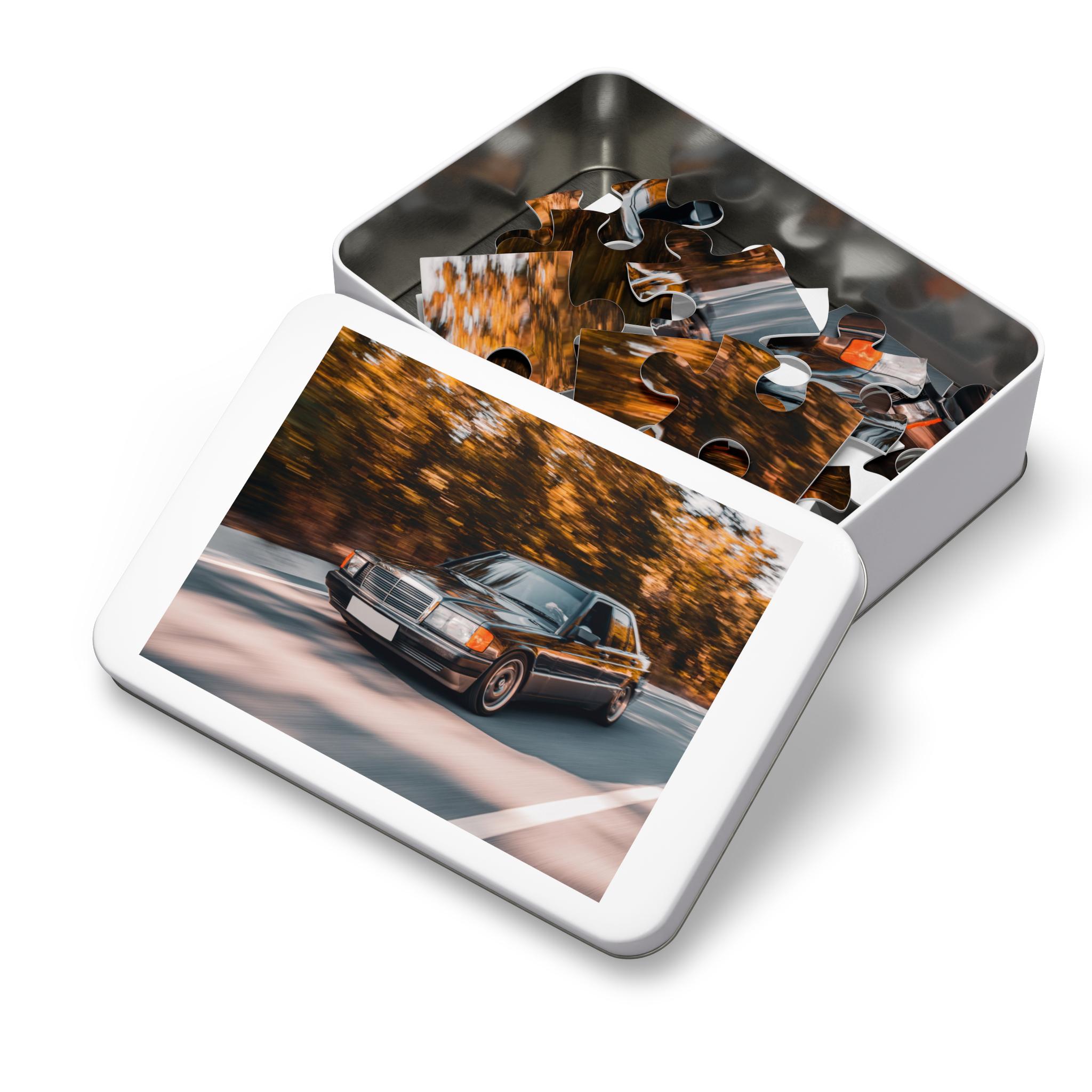 This glossy car-themed puzzle brings motion and nostalgia to game night. Printed in vibrant, true-to-photo color on sturdy pre-die-cut chipboard, the image of a classic sedan streaking past autumn trees invites you to slow down and savor each connecting piece. Choose from a range of sizes — from a quick 30-piece challenge to an absorbing 1000- or 2000-piece session — and assemble the photograph on the matching box or the white metal tin, both featuring the finished image. The uniform, precisely interlocking pieces and glossy finish make the picture pop and the build satisfying. Keep the completed puzzle in the tin for display or gift it ready to impress.