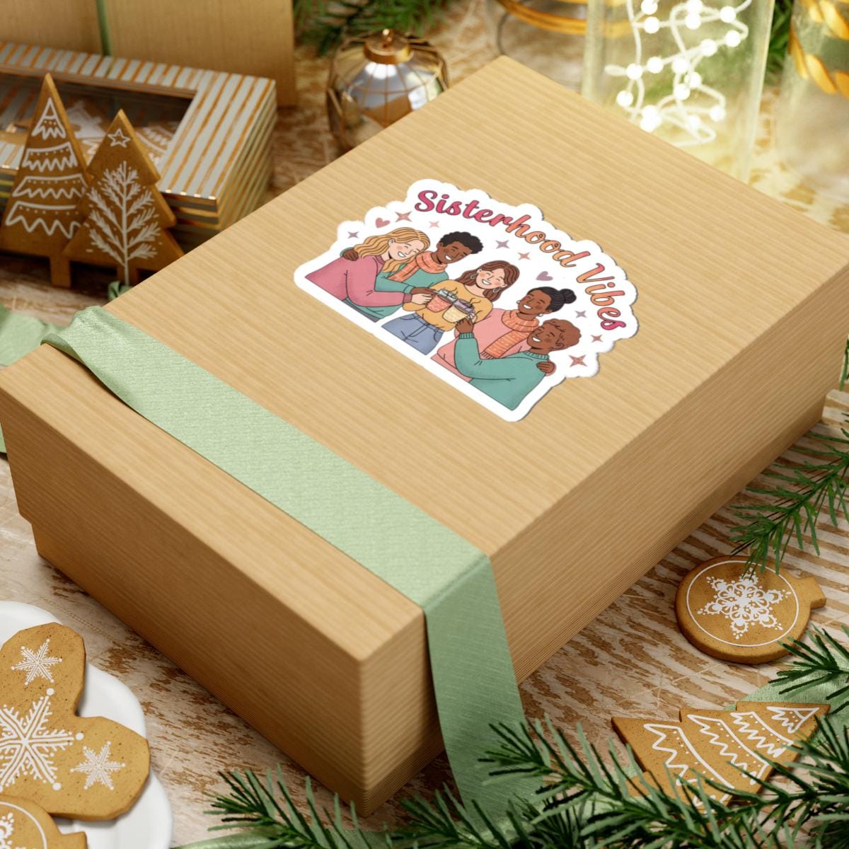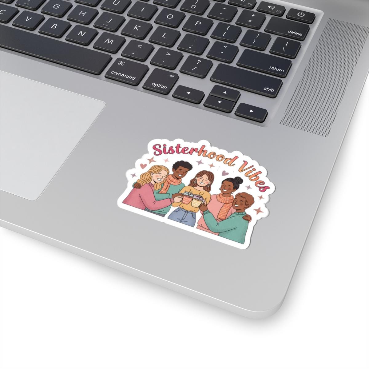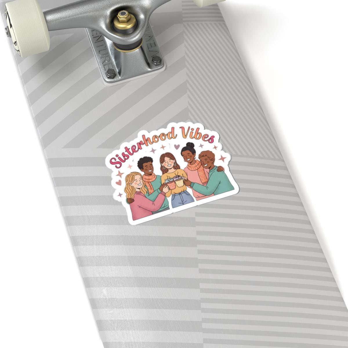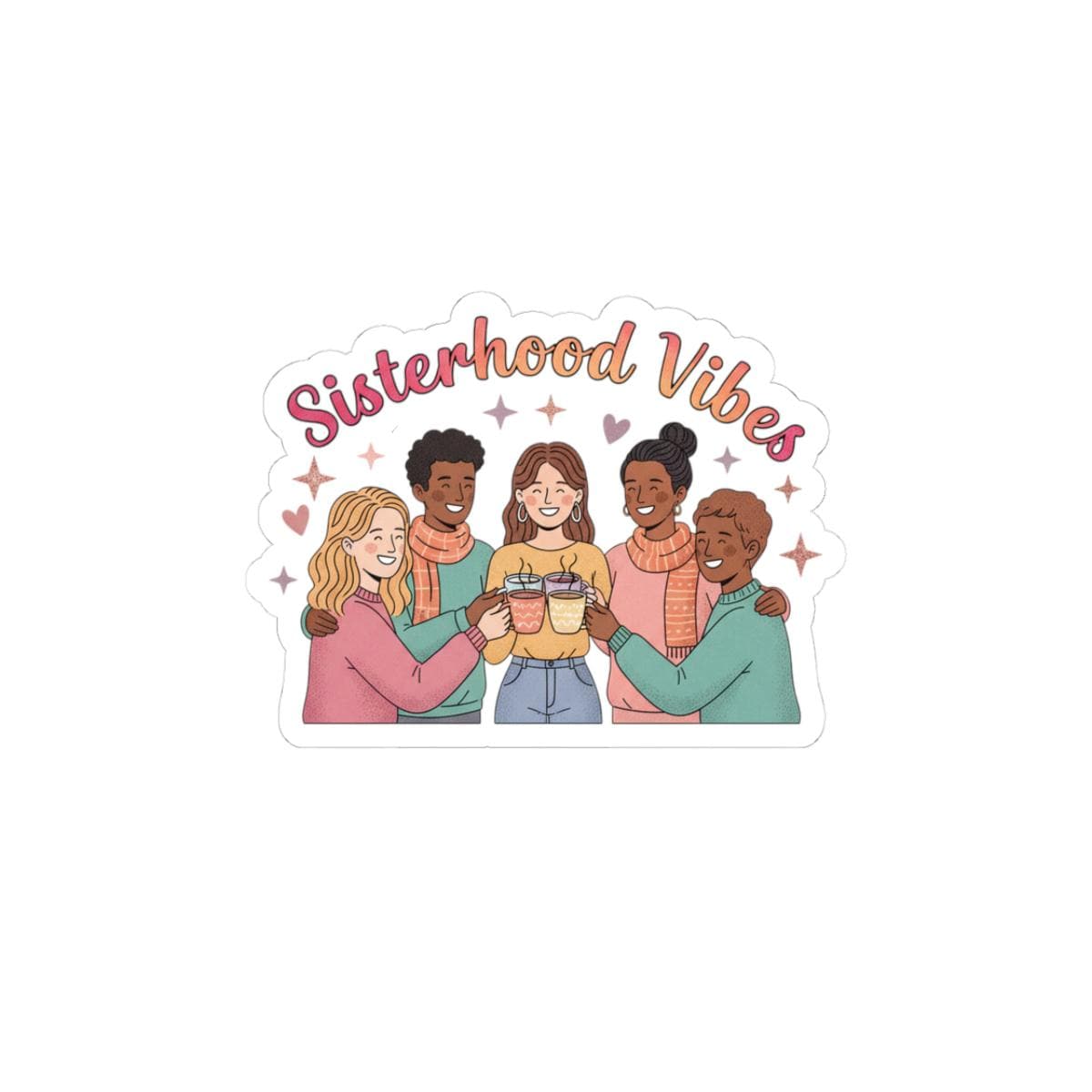 Sisterhood‑themed kiss‑cut sticker celebrating Galentine’s Day energy with a warm, inclusive illustration of friends linking arms and sharing a toast. Soft pinks, muted peaches and cozy earth tones plus rounded script evoke approachable camaraderie and lighthearted togetherness — designed to complement Galentine party packs, friendship swaps, or everyday reminders of your group identity.